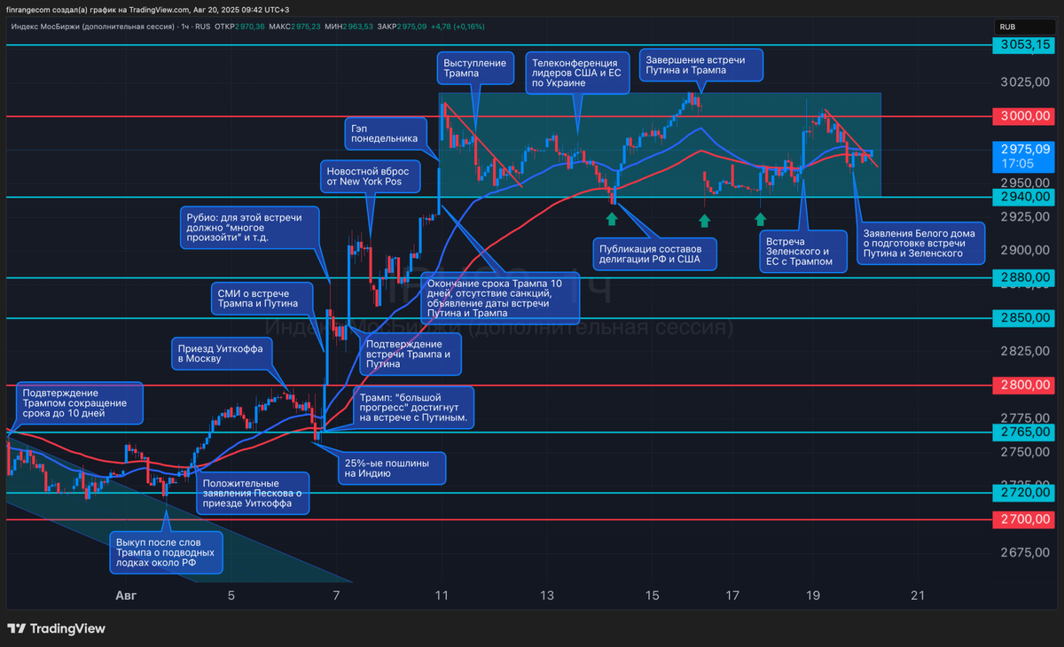 Российский рынок снова переходит в стадию зависимости от новостного фона. Более того, мы как и ранее, растём утром и вечером в отсутствии профучастников и снижаемся на основной сессии. Вчера с утра мы выросли на 0,7-0,8% на слухах подготовки встречи между президентов РФ и УКР. Далее с открытия основной сессии, индекс МосБиржи упал на 1,7%, несмотря на продолжающийся новостной фон. На каждой новости о потенциальной встречи рынок дёргали вверх, а затем мы снижались. На этом фоне мне пришлось закрыть спекулятивные позиции по акциям #T и #SGZH, через перетягивание стопов. Обе позиции давали хорошую прибыль, но в итоге получилось заработать всего +17,5 тыс. руб. Уже вечером, в отсутствии профучастников на пустых стаканах, на заявлениях Белого дома рынок вырос на 0,75%. При этом, заявления совпали с ранее опубликованной информацией в СМИ. Пока индекс МосБиржи находится в боковике 2940-3020 пунктов. Сегодня пробили локальный тренд в рамках вчерашнего снижения. Есть вероятность, что пойдём в с