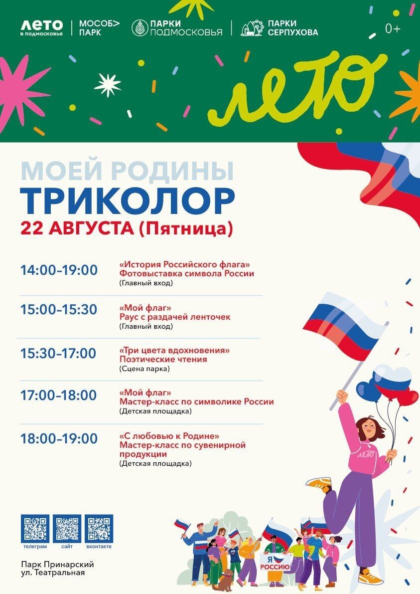 ✨ Фестиваль "Моей Родины триколор" 🌳Парк им. Олега Степанова ▪️14:00-15:00 Мастер-класс ▪️15:00-16:00 Концерт духового оркестра ▪️16:00-18:00 Квиз ▪️17:00-19:00 Фильм "Эхо войны" 🌳Парк Принарский ▪️15:30-17:00 Поэтические чтения ▪️17:00-19:00 Мастер-классы 🚫 Возраст: 0+ 📆 22.08.2025 💰 Вход свободный❗️ ⭐Разместить публикацию ⭐Поддержать канал голосом 💰 Стань курьером в Серпухове – твой доход, твое время! ✅ Мероприятия Серпухов https://dzen.ru/id/66f01c6eb4c6fe60c9ca1608 http://vk.com/serpukhov_events http://dzen.ru/serpukhov_events