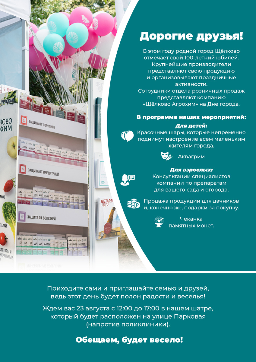 К юбилею любимого города «Щелково Агрохим» вместе с другими крупнейшими производителями приготовила незабываемые активности для взрослых и самых маленьких гостей. Приглашаем семьи поучаствовать в чеканке памятных монет! 👪 📅 Когда: 23 августа с 12:00 до 17:00 Где: В шатре «Щелково Агрохим» на улице Парковая (напротив поликлиники). 🎈 Аквагрим и волшебные красочные шары поднимут настроение детям, а родители смогут получить подробную консультацию по препаратам для сада и огорода. Приглашаем семьи понаблюдать за чеканкой памятных монет, изучить широкий ассортимент нашей продукции и получить приятные подарки за покупку 🎁 Удивимся на Дне города, друзья! Этот день обещает быть особенно радостным. Приобрести продукцию АО «Щелково Агрохим» можно в магазинах сетей Fix Price, «ОБИ», «Ашан», «ЛеманаПРО», а также онлайн в интернет-магазинах Wildberries, Rutrum.