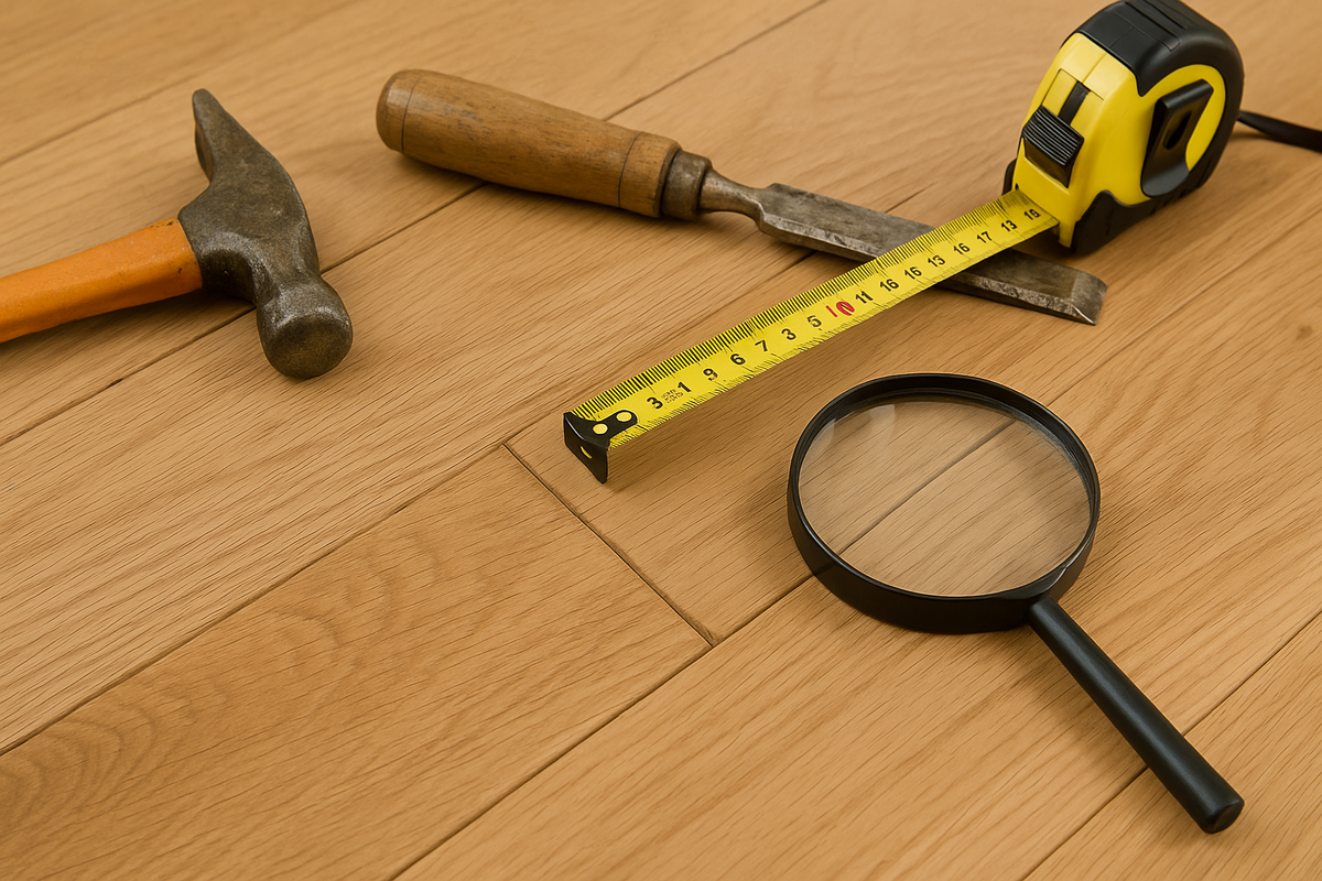Скрипучие участки внешне могут выглядеть нормально, но стоит проверить зазоры: расшатанные плашки часто образуют щели или немного прогибаются под ногой. Осматриваются также периметры и швы: нет ли мест, где паркет вплотную упёрся в стену или колонну (что указывает на отсутствие зазора). При наличии плинтусов можно приподнять или снять один из них в углу, чтобы проверить размер зазора между покрытием и стеной – он должен быть порядка 1–1.5 см; отсутствие зазора подтверждает вероятную причину вздутия.
