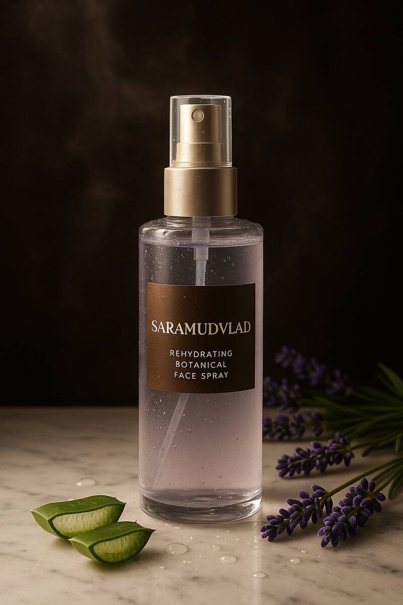 «Роскошный увлажняющий мист для лица в прозрачном пластиковом цилиндрическом флаконе с распылителем тонкого тумана и прозрачным колпачком. Белая матовая этикетка с элегантным шрифтом: LUNAR MIST — Rehydrating Botanical Face Spray. Дополнительный текст описывает экстракты алоэ, лаванды и женьшеня. Жидкость светло-лавандового цвета. Флакон стоит на белом мраморном столике со спа-освещением и каплями воды. Вокруг разложены свежая лаванда и срезы алоэ. Мягкое естественное освещение подчеркивает чистый и премиальный дизайн».