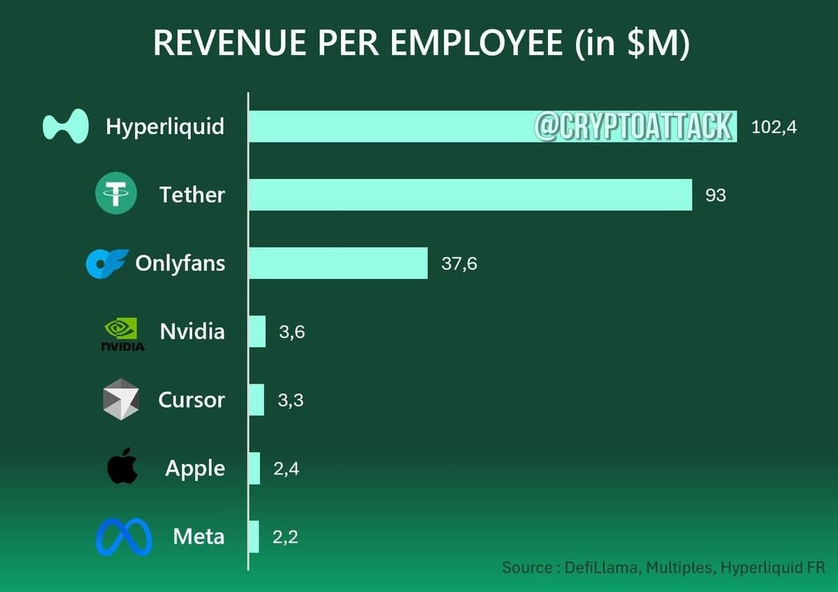 💰 #HYPE Криптобиржа Hyperliquid стала самой прибыльной компанией в мире по доходу на сотрудника — $102 400 000 на одного работника, в компании работает всего 12 человек.