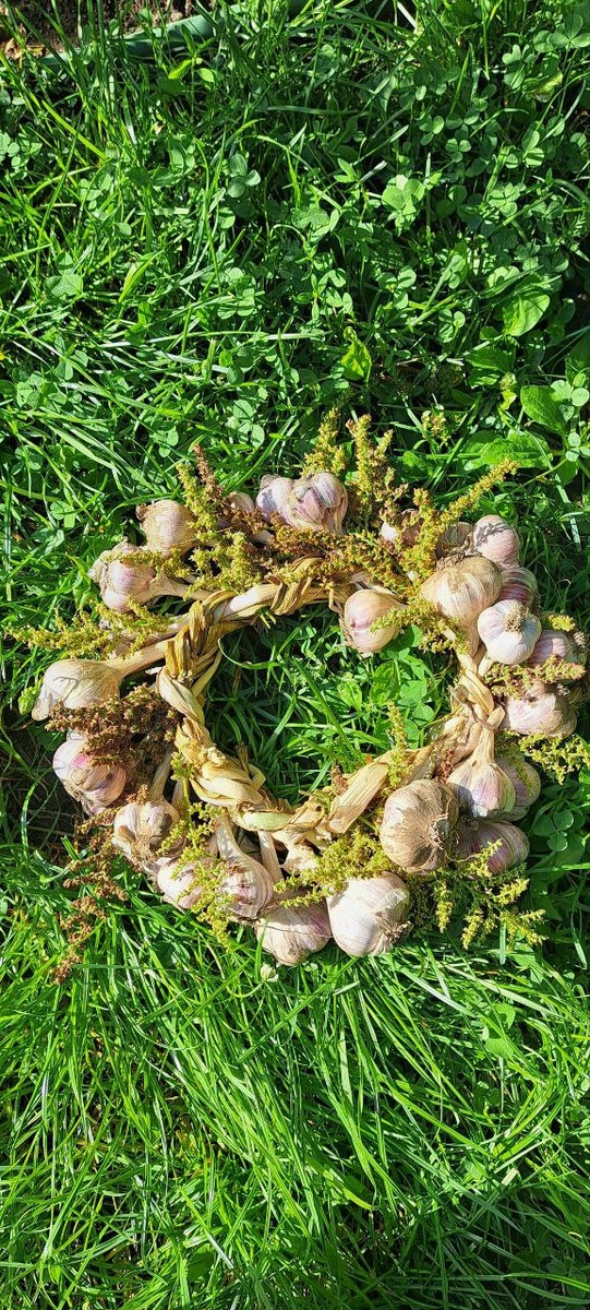 ЧЕСНОК. ЭСТЕТИЧНО. Ещё один вариант хранения чеснока. Всё очень просто- плетёте обычную косички и одновременно вплетаете цветы 🌸🌸🌸🌸🌸 . У меня это цветы астильбы. А ещё очень красиво смотрелись бы колосья. Заплетаете в венок. Красота. #эстетика #чеснок