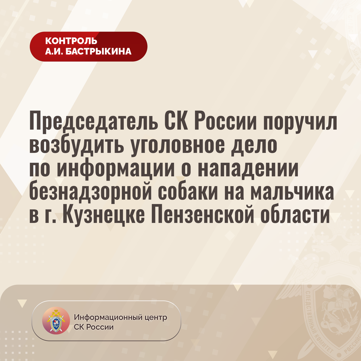 Председатель СК России поручил возбудить уголовное дело по информации о нападении безнадзорной собаки на мальчика в г. Кузнецке Пензенской области В СМИ сообщается, что в августе текущего года в городе Кузнецке Пензенской области бродячая собака набросилась на ребенка, укусив за лицо. Малолетний госпитализирован. Отмечается, что в населенном пункте неоднократно происходили аналогичные случаи. В СУ СК России по Пензенской области по данному факту организована процессуальная проверка. Председатель Следственного комитета Российской Федерации Александр Иванович Бастрыкин поручил руководителю СУ СК России по Пензенской области Владимиру Викторовичу Игнатенкову возбудить уголовное дело и представить доклад о ходе и результатах его расследования. Исполнение поручения поставлено на контроль в центральном аппарате ведомства. #СледственныйКомитет #СКРоссии #СКР #ИЦСКР #ИнформационныйЦентр #АлександрБастрыкин #ПредседательСКР #КонтрольПредседателяСКР #КомментарийКонтроль #ПензенскаяОбласть