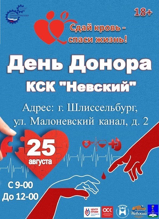 Сдай кровь - спаси жизнь! 25 августа 2025 года приглашаем всех желающих старше 18 лет, не имеющих противопоказаний к донации, принять участие в акции «День Донора». Адрес: Шлиссельбург, ул. Малоневский канал, дом 2, КСК «Невский» Время: с 9-00 до 12-00 При себе иметь: паспорт, полис и СНИЛС. Меры социальной поддержки для доноров: - справка на 2 дня отдыха - компенсационная выплата на питание 1634 руб «День Донора» организован предприятием ОСК «Невский ССЗ» совместно при поддержке Администрации МО г. Шлиссельбург и КСК «Невский». Возможны ограничения по забору крови, следите за нашими объявлениями! ОСК | НевскийССЗ