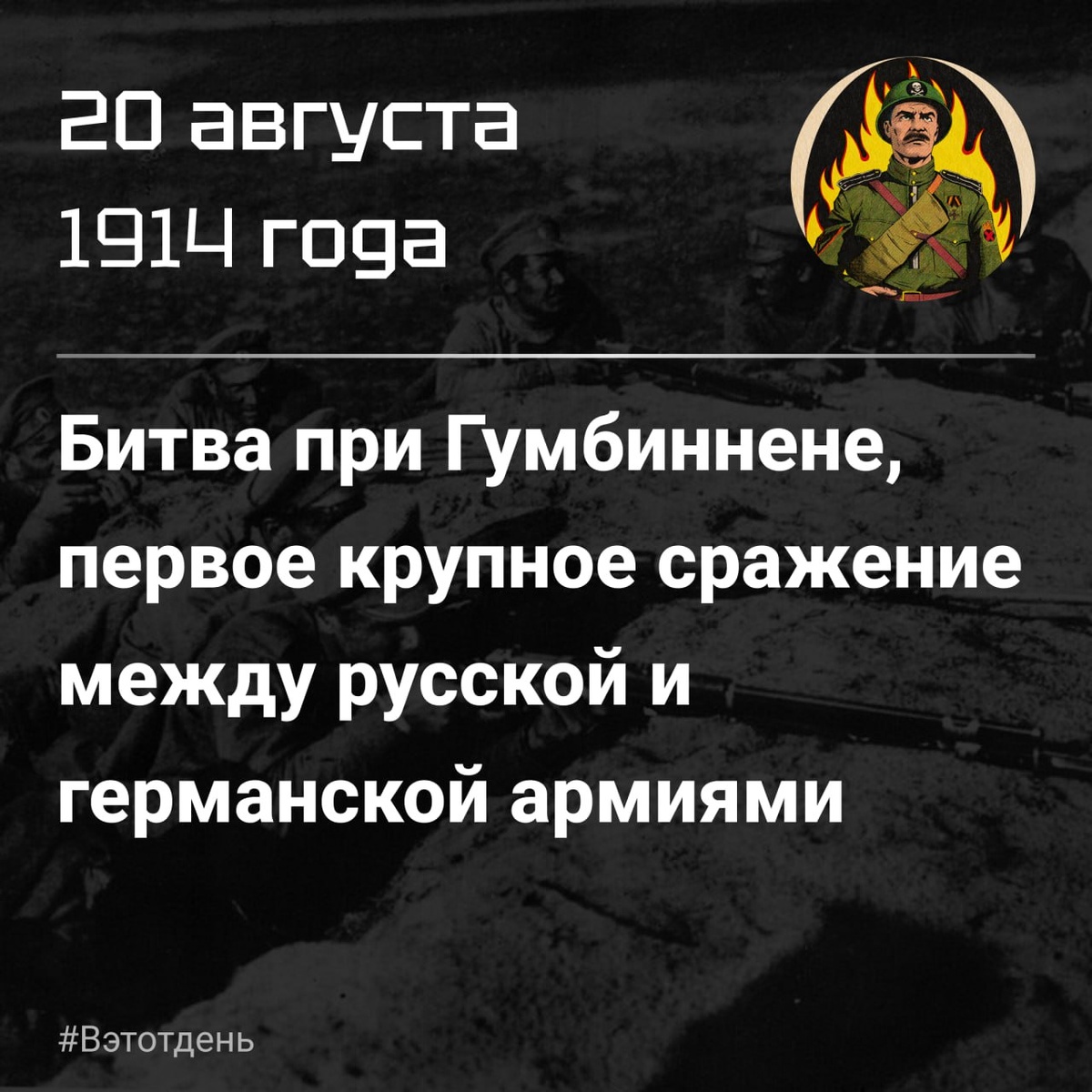 В самом начале Восточно-Прусской операции Первой мировой войны произошло первое крупное сражение между русской и германской армиями, бой у города Гумбиннен (ныне Гусев, Калининградская область). После вторжения русских войск в Восточную Пруссию германское командование решило нанести упреждающий удар, чтобы сбить наступление 1-й армии генерала Павла Карловаича Ренненкампфа. На рассвете 20 августа германские войска под командованием генерала Германа фон Франсуа атаковали русские позиции. Сражение быстро приняло ожесточённый характер: немецкая артиллерия и пулемётный огонь нанесли значительные потери наступавшим. Однако дисциплина и численное превосходство русских корпусов сыграли решающую роль. Русские войска выдержали натиск, затем перешли в контратаку и обратили германские части в беспорядочное отступление, захватив пленных и трофеи. Это была первая крупная победа русской армии в Первой мировой войне. Германские войска отступили, а Восточная Пруссия оказалась под угрозой более глуб