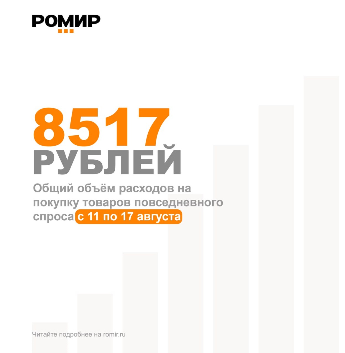 8517 рублей потратила в среднем на продукты питания и товары повседневного спроса среднестатистическая российская семья на неделе с 11 по 17 августа, что на 138 рублей (1.6%) больше, чем неделей ранее. Относительно аналогичной недели прошлого года объем недельных расходов вырос на 408 рублей или на 5%. 🔸Одной из возможных причин увеличения общего объема трат в годовом выражении может являться возросшая частота покупок. Суммарные недельные расходы семьи могли увеличиться не за счет роста стоимости одной покупки, а благодаря большему числу походов в магазин, что в итоге и привело к повышению общего объема трат относительно прошлого года. #индекснедельныхрасходов #индекспокупательскойактивности @m_romir