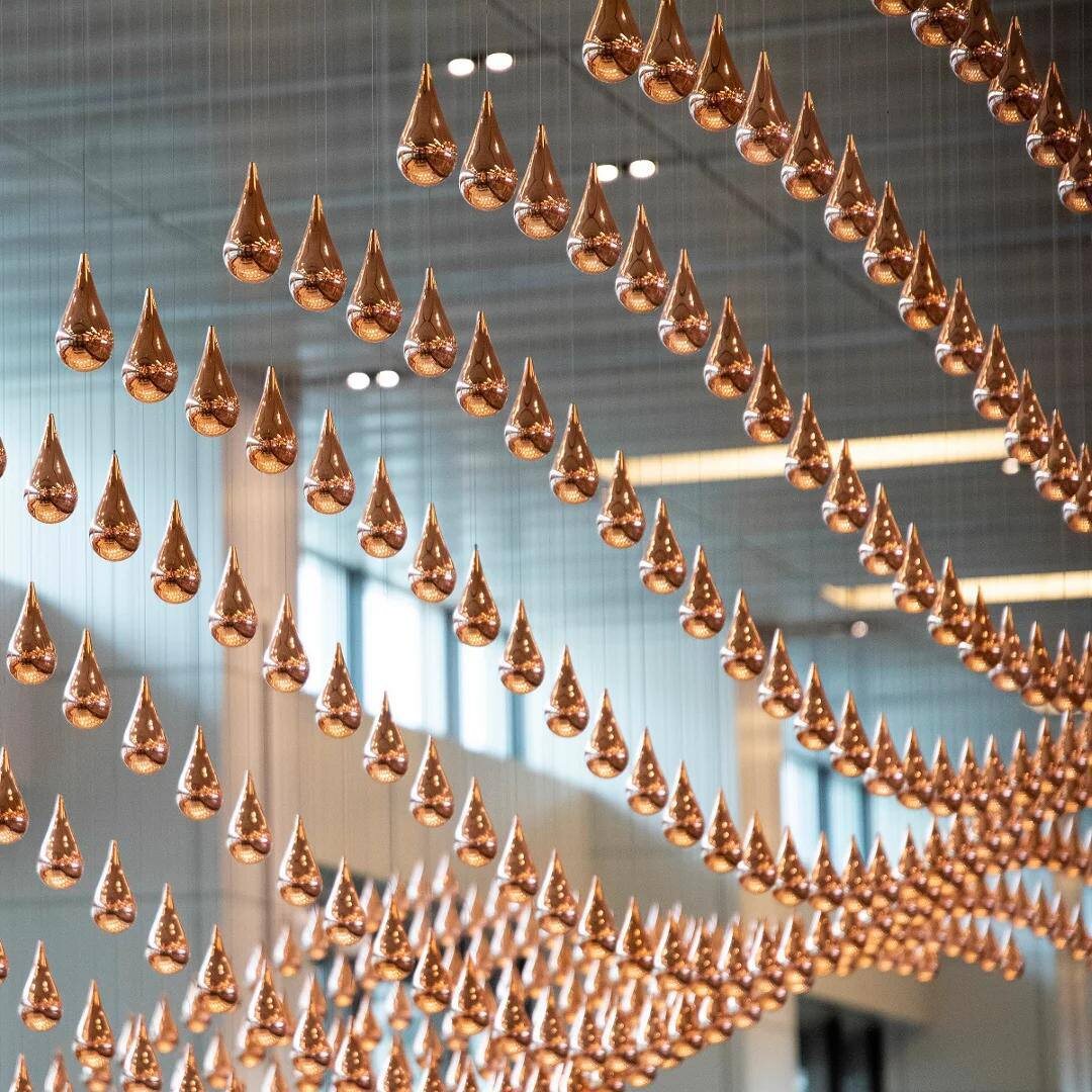 Топ-5 визуальных приёмов, которые всегда работают (Часть 1) На выставках и форумах у бренда есть всего несколько секунд, чтобы зацепить взгляд посетителя. Эти приёмы стабильно работают, потому что они воздействуют на восприятие на уровне базовых реакций человека: ✅ Синхронная кинетика Движущиеся элементы, например, панели, цилиндры, подвесы, синхронно перемещаются в заранее заданном ритме, формируя чёткую пространственную хореографию. Такое движение воспринимается зрителем как упорядоченный паттерн: глаз фиксирует повторяющуюся последовательность, а мозг распознаёт её как закономерность, что автоматически удерживает внимание и усиливает эффект вовлечения. Пример: Kinetic Rain в аэропорту Сингапур Чанги — 608 «капель» поднимаются и опускаются в 3D-паттерне, формируя силуэты объектов на 15-минутном цикле ✅ Крупные ритмические формы Это выразительные элементы значительного масштаба, расположенные в пространстве так, чтобы создавать ощущение визуального ритма и цельности композиции.
