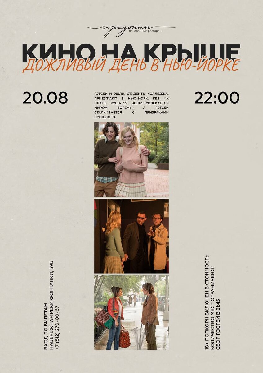 Ночное кино на крыше Вечерняя прохлада, закуски, вино, приятная компания и кино на проекторе. Всё это с видом на величественный Петербург! Показывают фильм Вуди Аллена "Дождливый день в Нью-Йорке". Это кино о Гэтсби и Эшли, студентах колледжа, которые приезжают в Нью-Йорк, где их планы рушатся: Эшли увлекается миром богемы, а Гэтсби сталкивается с призраками прошлого. ⏰ 20.08 в 22:00 (сбор гостей 21:30-21:45) 💵 от 3 600 ₽, купить билет 📍 Ресторан «Горизонты», Торговый переулок, 3 Количество мест ограничено! Бронирование по телефону: +7 812 317 27 00 При бронировании компанией от 6 человек в счет будет включен сервисный сбор 10%. Подпишись на Пойдем сегодня Петербург