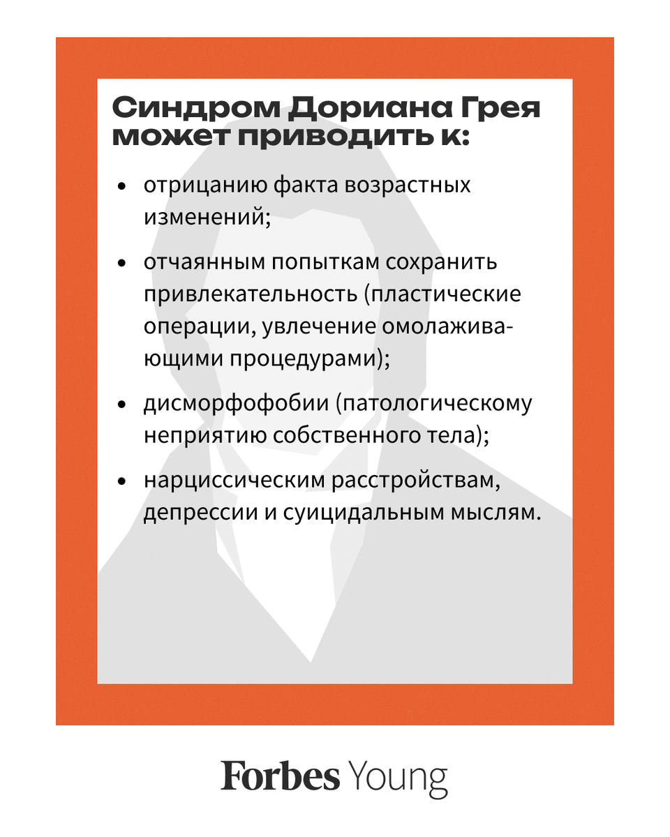 Чрезмерную обеспокоенность своей внешностью и сопротивление возрастным изменениям называют синдромом Дориана Грея. Официального статуса у синдрома нет. Добрая половина профессионального сообщества не относится к нему серьезно и считает это скорее социальным проявлением. Остальные склонны рассматривать его как клинический синдром либо ипохондрическое или ментальное расстройство.