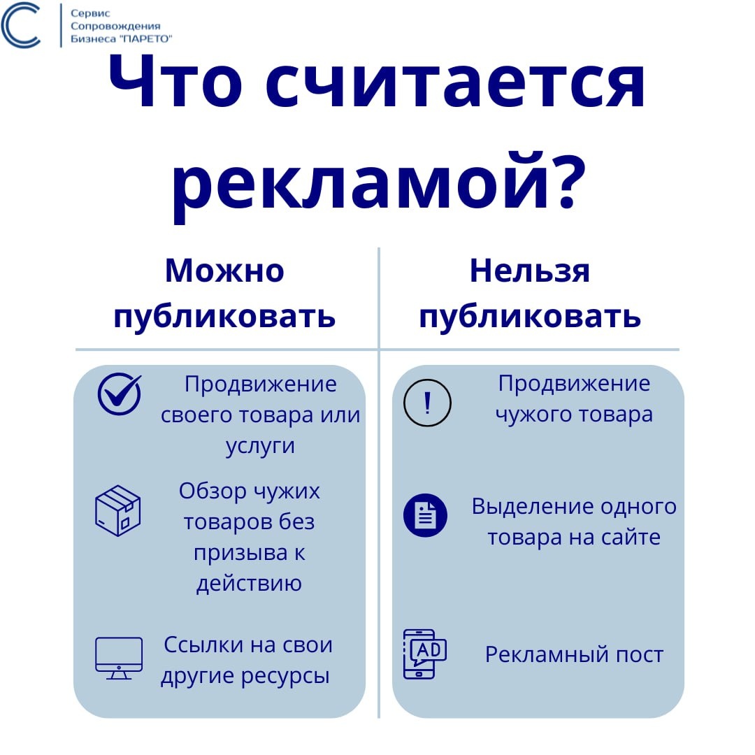 Реклама в Instagram*: гид по запретам Вчера мы писали про скорый запрет рекламы в Instagram* и получили от вас много вопросов на этот счет. Давайте немного углубимся в этот вопрос и разберемся: что все таки можно публиковать, а что нельзя. Для этого нужно понять, что такое реклама и что к ней можно отнести, обратимся к официальным разъяснениям Федеральной Антимонопольной службы. ✅ Что НЕ считается рекламой (можно публиковать): 🎯 Продвижение СВОЕГО товара/услуги на СВОЕЙ странице в социальной сети или на СВОЕМ сайте — Можно публиковать акции, скидки, специальные предложения для ваших подписчиков (то есть для людей, которые ведут блог о своем товаре и продают его на своей страничке в соц.сетях рисков нет) 🎯 Обзоры ЧУЖИХ товаров без призывов к покупке — Например, автомобильный блогер тестирует разные машины (главное соблюдать единую тематику блога) 🎯 Ссылки на свои другие ресурсы — Переходы в Telegram-канал, сайт или другую соцсеть ❌ Что считается рекламой (запрещено): 🔴 Продв