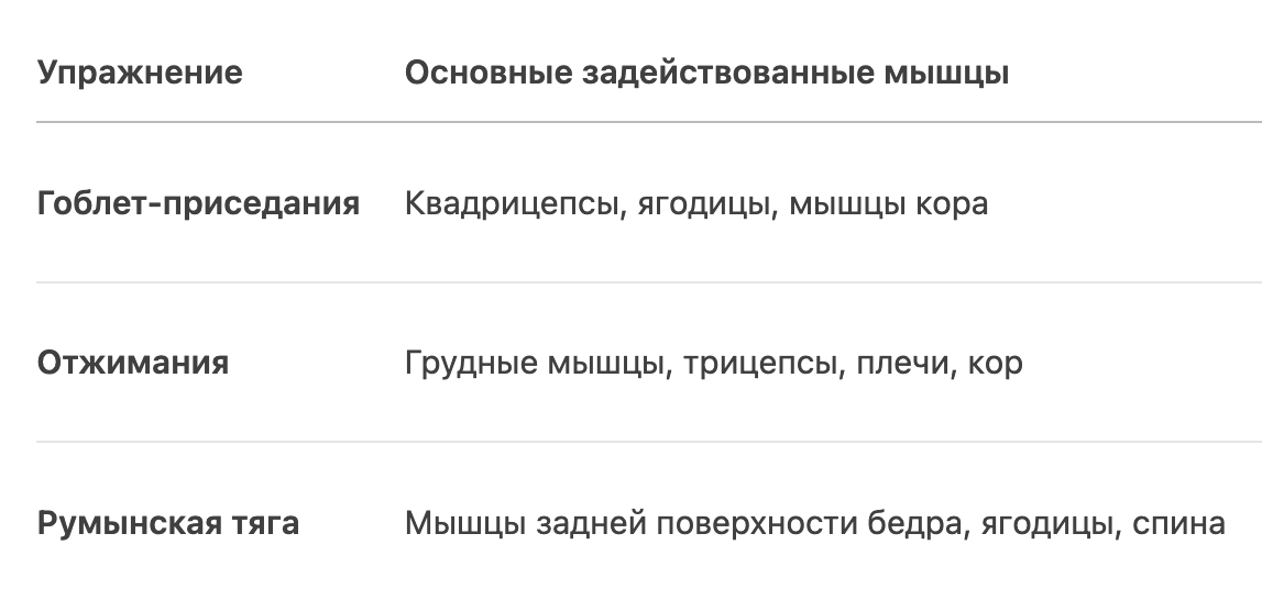 - Пятница: Гоблет-приседания (3 подхода по 8-12 повторений), Румынская тяга (3 подхода по 8-10 повторений)