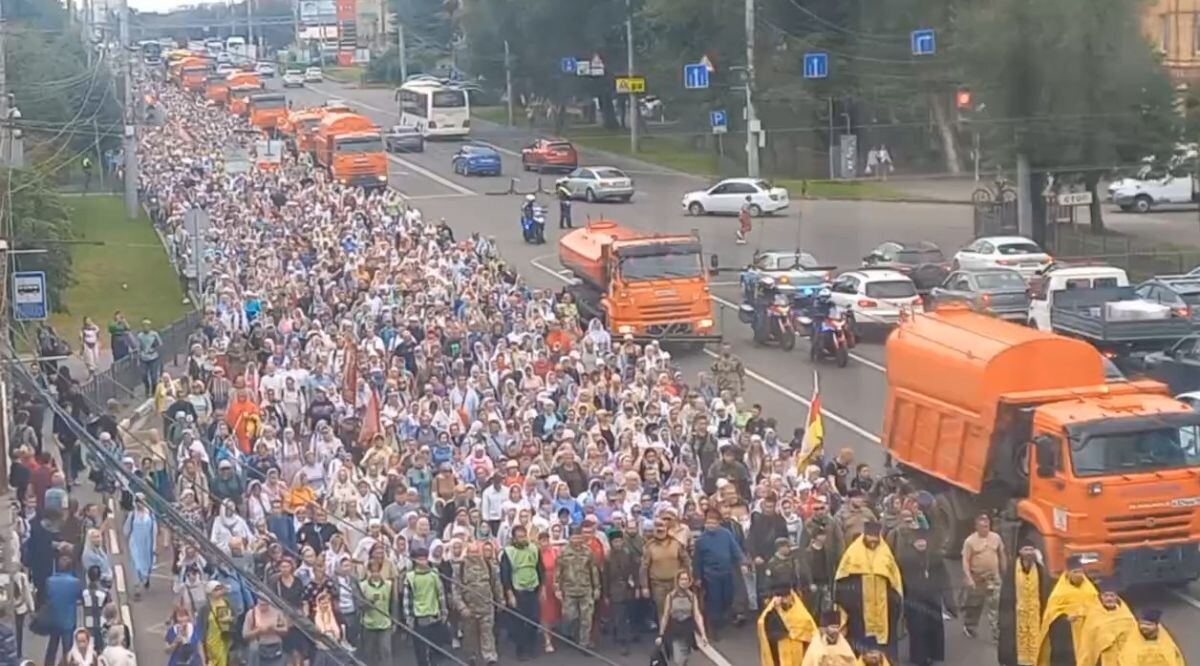 Тысячи паломников, идущих по Московскому проспекту в Воронеже, стали причиной пробки