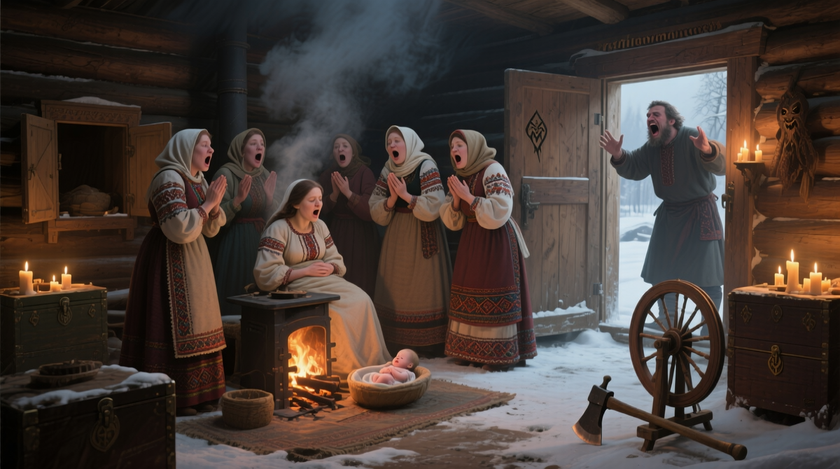 Представьте себе глухую деревню где-нибудь в Суздале. Зима. Снег ложится на крыши изб, а внутри — напряжённое ожидание. В углу избы стонет роженица, а вокруг стоят-сидят женщины с открытыми ртами. Да-да, вы не ослышались. С открытыми ртами. Это был не просто перекур во время родов — это был ритуал. Считалось, что в момент родов все земные двери, сундуки и даже уста должны быть раскрыты, чтобы путь ребёнка в этот мир был лёгким. Если дверь останется приоткрытой, роды могут затянуться. Если кто-то закроет рот, «душа младенца застрянет». Даже конскую сбрую развязывали, а петли на одежде расстёгивали. Всё должно было «раскрыться» вместе с матерью. А знаете, кто кричал во время родов? Не сама женщина. А её муж. Да, в старину считалось, что если женщина будет кричать от боли, то её голос привлечёт нечисть. А злые духи, как воры в ночи, могли украсть душу младенца или подменить его на подкидыша. Поэтому на помощь приходил «тихомир» — особый обряд, во время которого мужчина, стоя у порога, ре