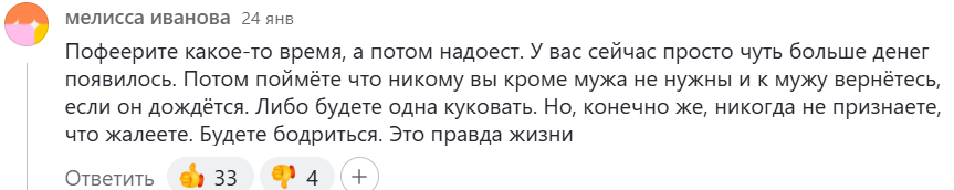 Я комментарии к статьям про свой развод читала, за голову хваталась. Сколько же женщин у нас в стране видят смысл жизни в мужчинах. Как же многих тригернуло то, что набралась смелости и решилась на этот шаг. Сколько же у нас женщин готовы жить в браке несчастными - главное, чтобы мужик в доме был! Или что люди скажут...
