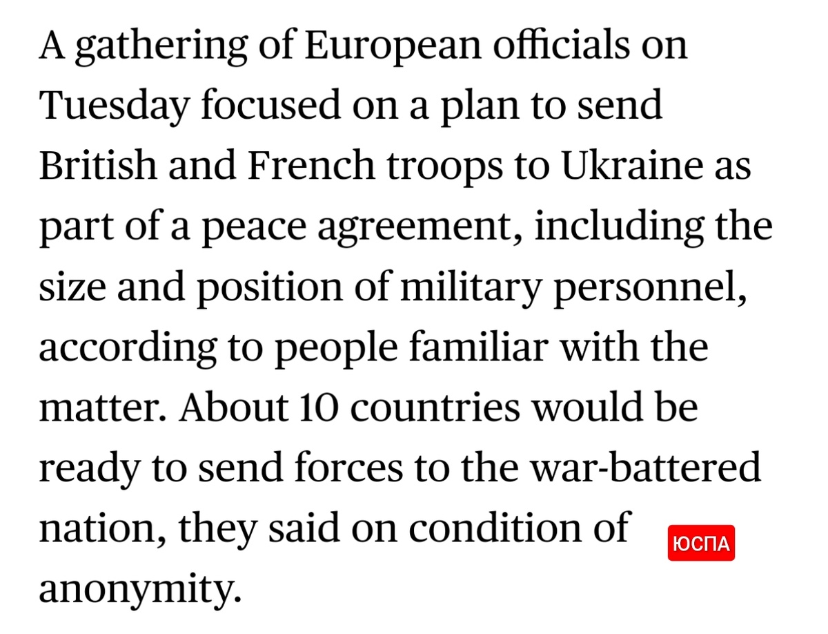 Блумберг сообщает, "что около 10 государств готовы отправить свои войска в озваченную войной страну (Украину - М.Ю.)" Речь, конечно, идёт не о военном участии, а о "гарантиях безопасности" для Киева в случае достижения договорённости о мире с Москвой. То есть это говорит нам о возможном превращении украинской территории в одну большую базу НАТО прямо у российской границы. Пока такое развитие событий не соответствует задачам СВО по демилитаризации Украины и устранение военной угрозы с этого направления. С другой стороны, украинские граждане тоже пока не в восторге. Ведь они "Боролись за нацию, а получили - колонизацию" © Михаил Юспа Подписаться