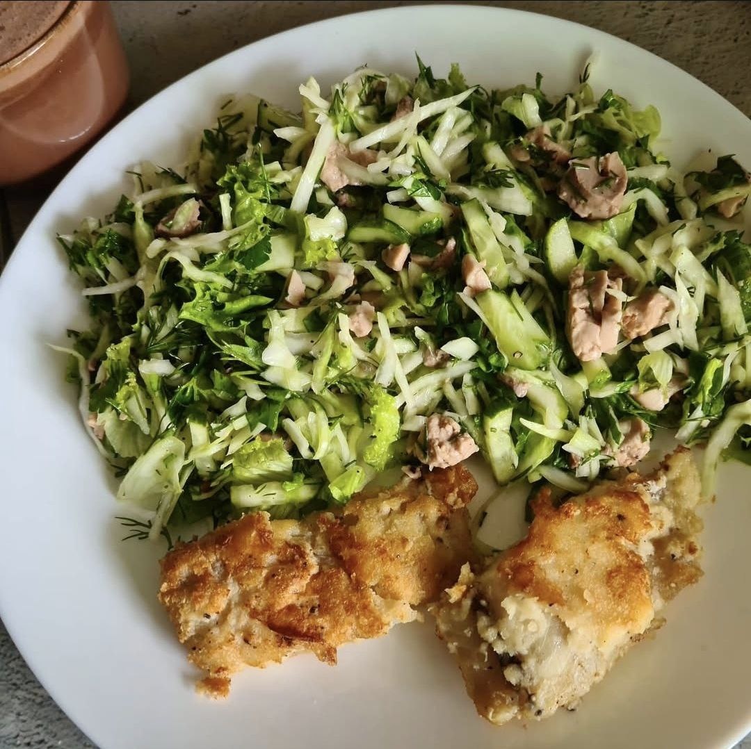 САЛАТ С ПЕЧЕНЬЮ ТРЕСКИ Ингредиенты: 📌 капуста белокочанная 📌 огурец 📌 листовой салат 📌 укроп 📌 петрушка 📌 печень трески натуральная Приготовление: Капусту нашинковать, полить яблочным уксусом, посолить и помять руками. Нарезать остальные ингредиенты. Печень нарезать небольшими кусочками, добавить в салат вместе с маслом. Хорошо перемешать. Можно добавить отварные яйца и солёный огурчик Филе минтая в панировке (филе нарезать порционными кусочками, посолить, поперчить, обмакнуть во взбитом яйце, затем в миндальной муке, обжарить на сильном огне с двух сторон до корочки)