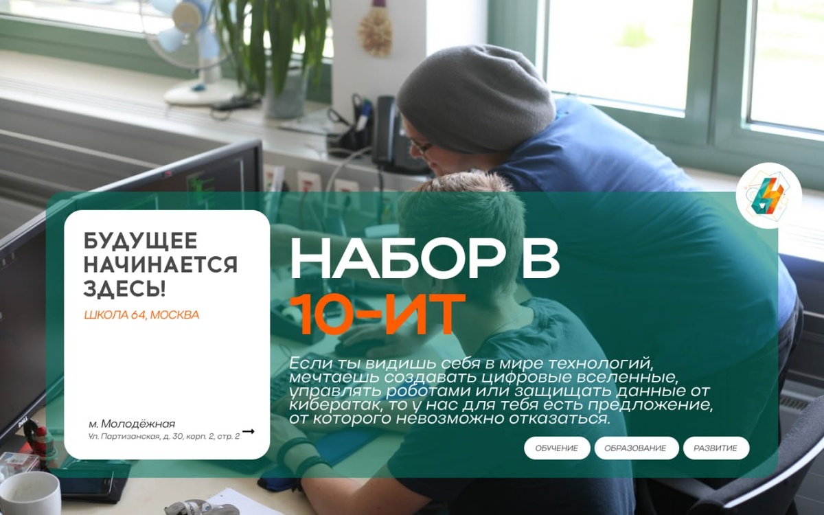 Школа №64 объявляет набор в 10 ИТ-класс — уникальный проект Департамента образования и науки города Москвы. Это не просто углубленное изучение предметов. Это твой первый шаг в карьере, востребованной по всему миру. Углубленное изучение главных предметов будущего: математика, информатика и физика станут основой твоего расписания. Ты не просто будешь решать задачи, ты будешь понимать язык, на котором говорит цифровой мир. Проектная работа и практика: ты будешь работать над реальными кейсами и создавать свои первые проекты под руководством опытных наставников. ИТ-специализации: программирование, робототехника, искусственный интеллект, большие данные — ты сможешь попробовать себя в самых актуальных направлениях и выбрать то, что по-настоящему зажигает. Для поступления необходимо:
