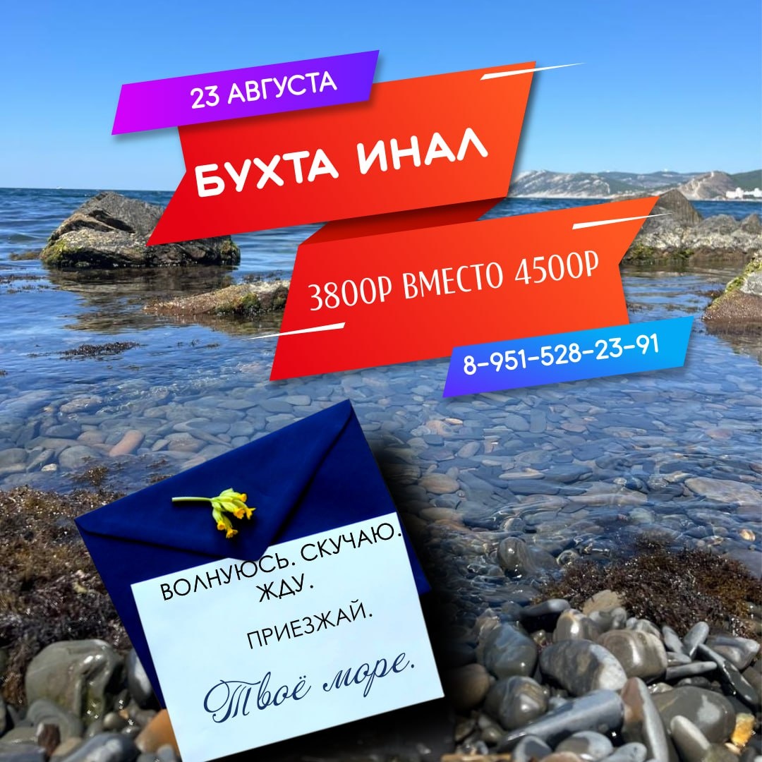 💛💛💛💛💛 💛 Время путешествия! 🤩🤩🤩🤩 Объявляем 🤩🤩🤩🤩 скидку 🤩🤩🤩🤩 на тур! В субботу 23 августа едем к морю в бухту Инал! ОСТАЛОСЬ ▫️ МЕСТ! ♦️Цена поездки: 3800Р 4500Р Цена единая для всех! ➡️Выезд 23 августа в 01:00 из Ростова Ворошиловский/Шаумяна (ориентир гостиница Европа). ➡️Так же забираем на Соленом озере, Солнечном, в Авиагородке и дальше по трассе М-4 в любом месте. ➡️Утром приезжаем к морюшку и купаемся целый день до вечера. Есть лежаки, навесы и кафе. ➡️В 19:00 выезжаем в Ростов. Прибытие в Ростов примерно в 01:00. 😉Включено: проезд, сопровождение, транспортная страховка. ✖️Доп. расходы: питание, личные расходы Связаться с менеджером: Телеграм/WhatsApp: 8-951-528-23-91