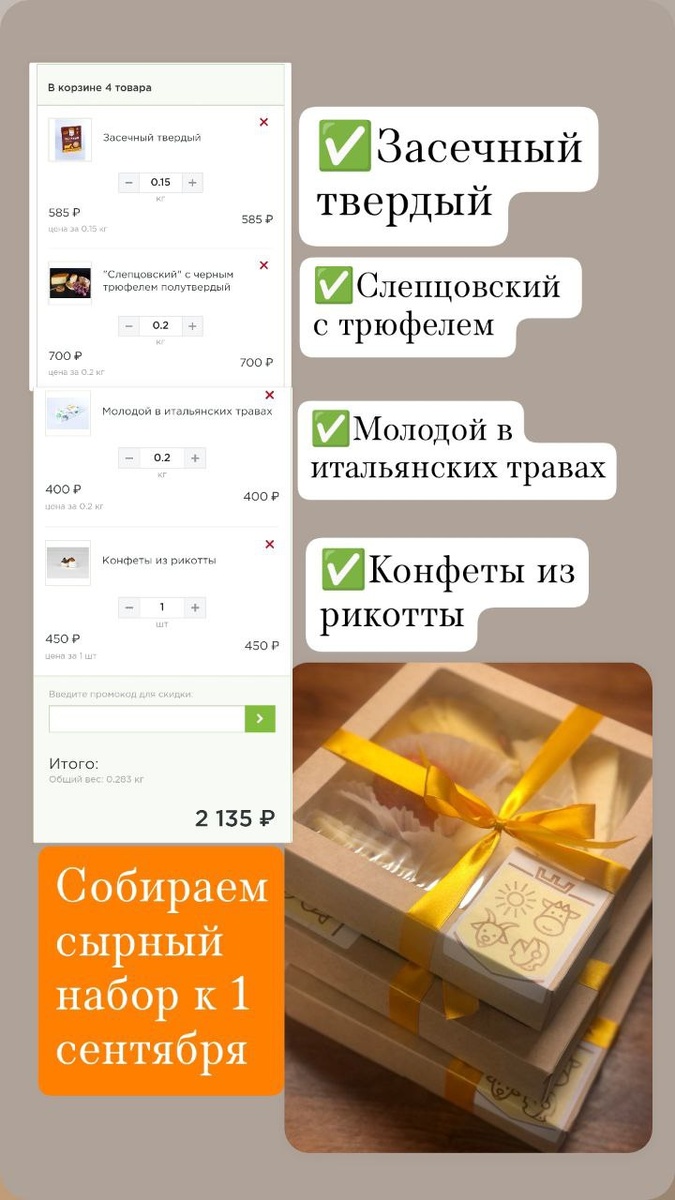 Варианты коробочек - как у Егорки) , а ещё есть плоский "квадрат" - его удобно сунуть в рюкзак😎 Посмотрите, несколько вариантов наполнения. СТОИМОСТЬ коробки на 4 сыра 2000р.