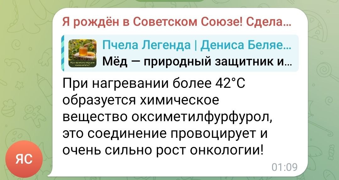ОПЯТЬ ЭТОТ СТРАШНЫЙ ФУРФУРОЛ Ко мне в личку (и в комментах) регулярно прилетает один и тот же вопрос, который всех беспокоит: «А правда, что если мед нагреть, в нем образуется страшный яд оксиметилфурфурол (ОМФ), который вызывает рак?» 😱 Сразу скажу: это один из самых живучих мифов о питании, который кочует из паблика в паблик, пугая бабушек и любителей чая с Мёдом. Давайте разбираться по-простому, без занудства. 1. ОМФ — он везде! И в КОФЕ его море! Этот самый оксиметилфурфурол образуется при нагреве ЛЮБЫХ продуктов, содержащих сахара (особенно фруктозу). Чтобы вы не переживали из-за капли Мёда в чае, вот цифры для понимания масштаба: 🔸Растворимый кофе: до 2000 мг/кг и даже больше! Чашка кофе — чемпион по ОМФ. 🔸Зерновой кофе до 500 мг/кг 🔸Чернослив 247 мг/кг 🔸Мёд свежий - практически нет 🔸Мёд (при длительном нагреве): до 300 мг/кг 🔸 Поджаристый хлеб: до 150 мг/кг 🔸Фруктовые соки (пастеризованные): до 50 мг/л И что, мы теперь от всего этого откажемся? 2. Доза — вот что