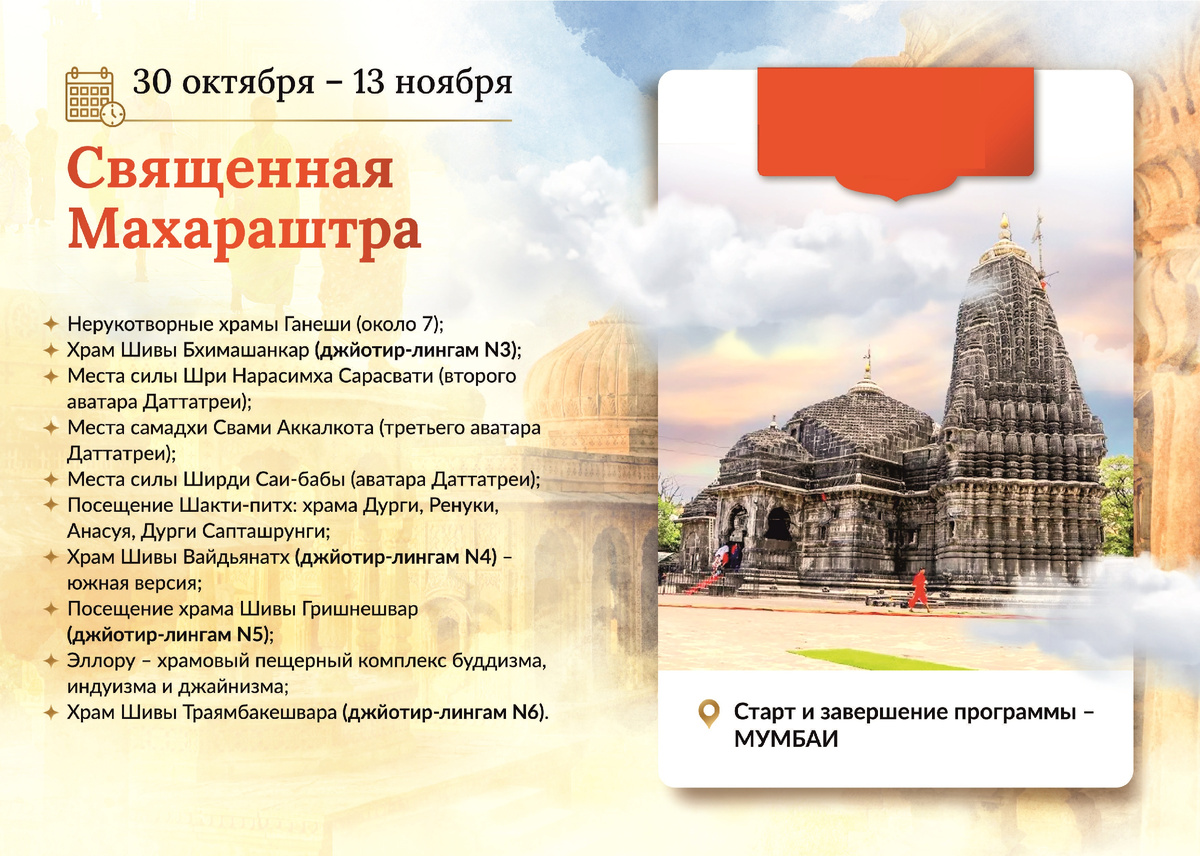 сакрального намерения в наших сердцах*** С 30 октября по 13 ноября 2025 года группа учеников Шри Гуру Вишнудевананда Гири с монахиней Махешвари Гири отправится по местам силы Ганапати, Шивы, Шакти и Даттатреи. Штат Махараштра считается одним из центров йоги в Индии благодаря богатству религиозных традиций, духовных практик и древних святых храмов. Конец года - это период внутренней трансформации: освобождения от старого и подготовки к новому этапу жизни с ясными намерениями и позитивным настроем. 5 джйотир-лингамов Индии – это место поклонения богу Шиве, в котором он представлен в виде лингама, символизирующего его сияние и энергию, мы посетим для разрушения больших преград и даровании милости. Учимся правильно выражать намерение через тишину ума и концентрацию, которой учит нас Махадев. «Санкальпа, выраженная из