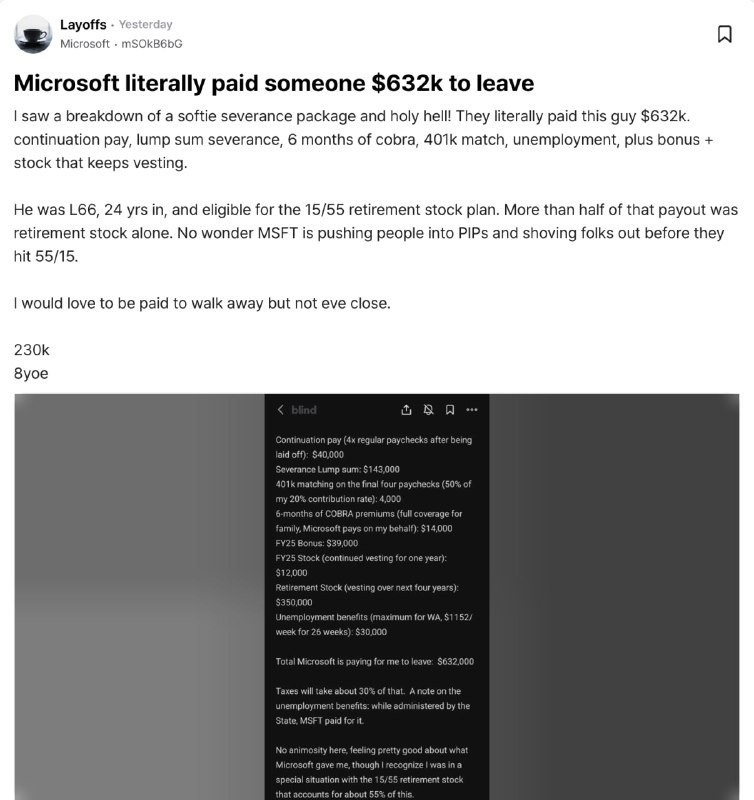 Мечта: Microsoft выплатила сотруднику $632 тыс. (₽50 млн) за увольнение. Разработчик, который проработал в компании 24 года, добился рекордного выходного пособия. Из этой суммы $143 тыс. он получил за стаж работы, а $30 тыс. — в связи с тем, что стал безработным. Кроме того, мужчине было выплачено $350 тыс. в виде акций. Всем желаю хорошего рабочего дня. Читать подробнее Наш уютный канальчик 🤖 Анимация | СhatGPT-4 | Помощь с резюме