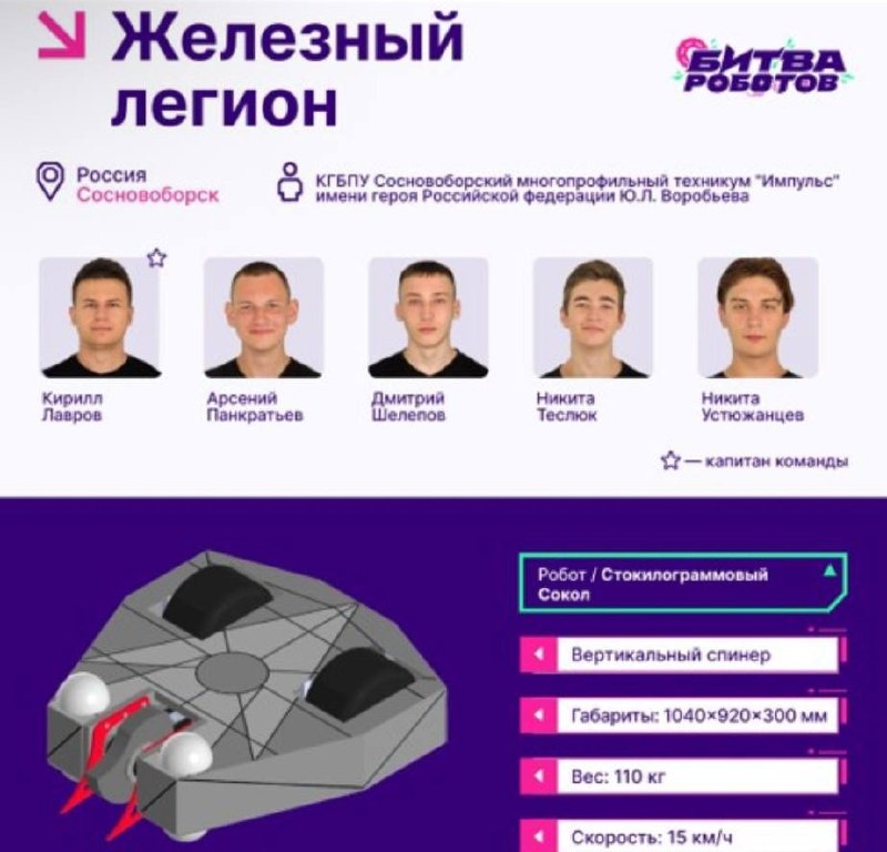🤖Студенты из Красноярского края сразятся в первом этапе «Битвы роботов» В Перми 23 августа пройдет первый этап международного соревнования по робототехнике «Битва роботов». В числе участников международного соревнования по робототехнике «Битва роботов» команда из Красноярского края. «Железный легион», представляют студенты Сосновоборского многопрофильного техникума. Команда состоит из пяти человек: Кирилл Лавров, Арсений Панкратьев, Дмитрий Шелепов, Никита Теслюк и Никита Устюжанцев. За право называться лучшими сразятся участники из Белгородчины, Воронежской, Московской областей, Пермского края, Башкортостана и других российских регионов Фото: Чемпионат «Битва Роботов» 🤩Новости Сибири | Прислать новость