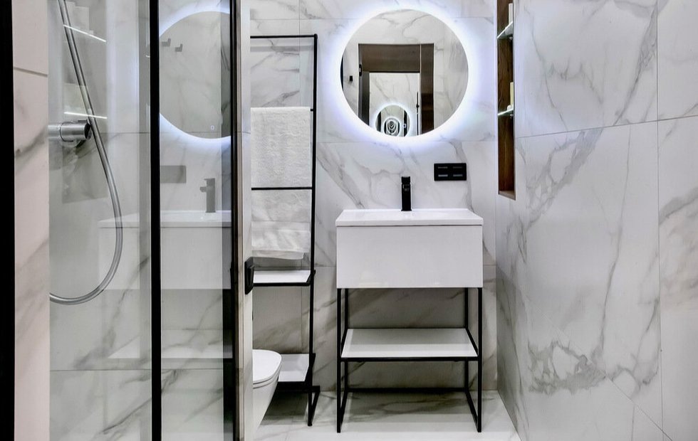 Выбор размера плитки — важный прием для визуального расширения. «На стенах у нас установлен керамогранит, тот же самый, что и в основном помещении. И если обратите внимание, здесь очень большой формат».