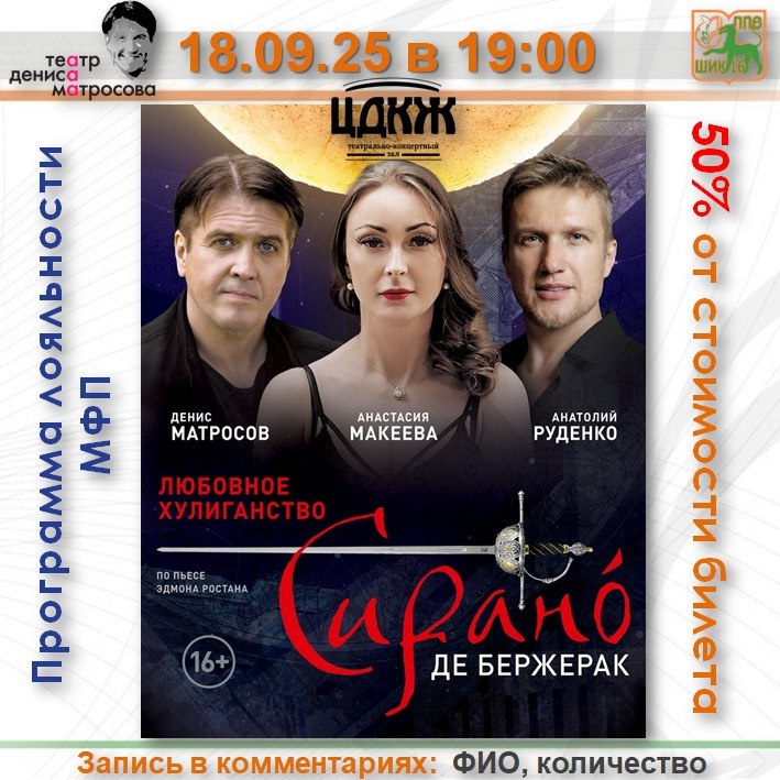 🎭 Партнёр Программы лояльности МФП — Театр Дениса Матросова приглашает! 💘 Любовное хулиганство в стихах и с песнями ✨ «Сирано де Бержерак» 📅 18 сентября 🕖 19:00 🏛 ЦДКЖ Специально для участников программы лояльности: Скидка 50% по промокоду (спрашивайте у председателя ППО) 💰 С учётом скидки билеты от 550 ₽ 🎟 Билеты на сайте: 👉 Купить билет https://ruteatr.ru/sirano ⏳ Продолжительность: 1 час 35 минут ⭐ В ролях: — Денис Матросов — Анастасия Макеева — Анатолий Руденко #МФП #МойТеатральныйМарафон
