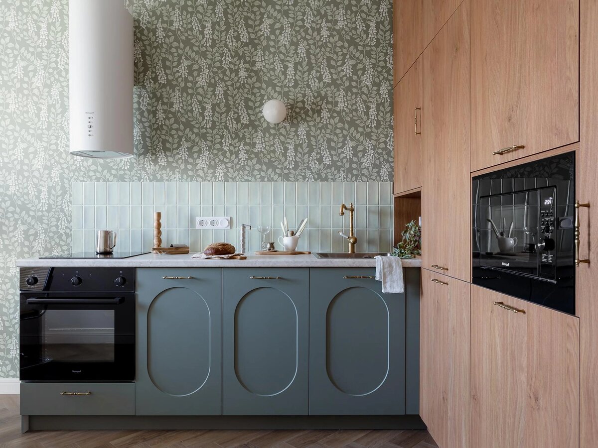 Никогда бы не подумали, что из квартиры под аренду можно сотворить такое: французские мотивы переплетаются с винтажными нотками и классикой. Этот проект принадлежит дизайнерам Buro Apart Seasons, и он достоин вашего внимания. Самое интересное всегда находится на кухне. Здесь это не стало исключением. Угловой кухонный гарнитур оформлен необычно. Нижние шкафчики выделяются овальной фрезеровкой, а верхние — так и вовсе отсутствуют. На их месте обои в наивный цветочек и легкий кухонный фартук из плитки-кабанчика, которую выложили вертикально в три ряда. Подметили на кухне: Получилось легко и воздушно. Тему невесомости подхватывают и светлая столешница, похожая на камень, смеситель и фурнитура из латуни. Вторая часть гарнитура отличается цветом и дизайном. Она прячет громоздкую технику: духовой шкаф и стиральную машину. Ниша у мойки выглядит игриво, но ее функционал тоже не оспорим. Тут можно сложить кухонную утварь и оставить место под декор. Стулья и стол рисуют в воображении французское