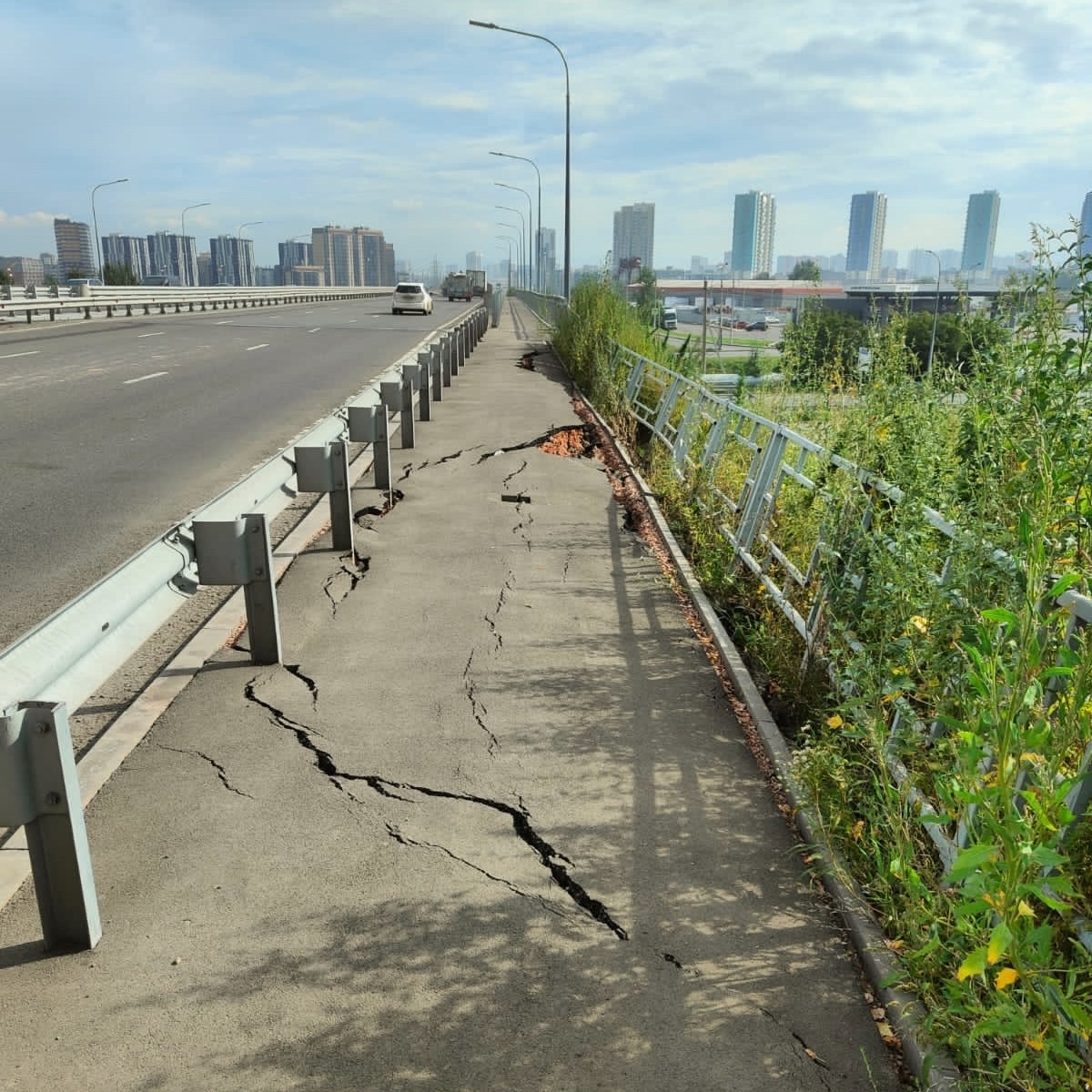 В Красноярске на развязке Северного шоссе разрушается тротуар. Об этом сообщили в департаменте градостроительства. Специалисты управления капитального строительства выявили провалы у опоры № 6. — Мониторинг развязки мы ведем постоянно. Первые дефекты выявили в июле, на что было указано подрядчику. Он их не устранил, провалы увеличились, поэтому сейчас отправили повторное требование до 25 августа устранить выявленные нарушения целостности покрытия. Согласно муниципальному контракту подрядчик должен за свой счет выполнить эти работы. Даже несмотря на то, что контракт с ним расторгнут, мы ведем работу в судебном порядке. Александр Парамыгин, и. о. руководителя МКУ «Управления капитального строительства». Развязку строила компания «Сибиряк», объект должны были сдать в 2024 году, но договор с подрядчиком расторгли, так как сроки затягивались. Развязка до сих пор не сдана в эксплуатацию. фото: vk.com/grad_vestnik