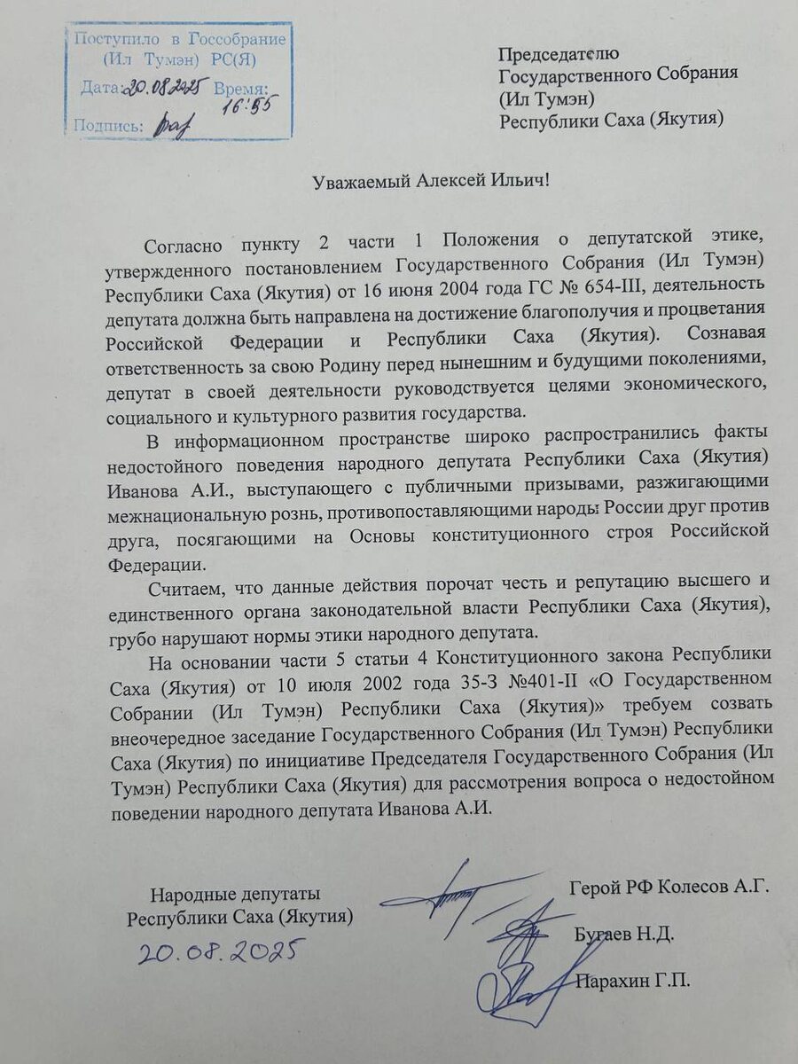 📣 Нардепы Якутии требуют созвать внеочередное заседание по вопросу скандальных заявлений депутата Александра Иванова Трое народных депутатов Якутии обратились к председателю Госсобрания республики с требованием провести внеочередное заседание парламента. Поводом стало резонансное интервью депутата Александра Иванова, в котором он высказал антигосударственную позицию. Соответствующий документ подписали народные депутаты Николай Бугаев, Герой России Александр Колесов и лидер регионального отделения ЛДПР Гаврил Парахин. Подробнее читайте по ссылке 🖥 Фото: ТГ-канала Николая Бугаева @Якутия 24
