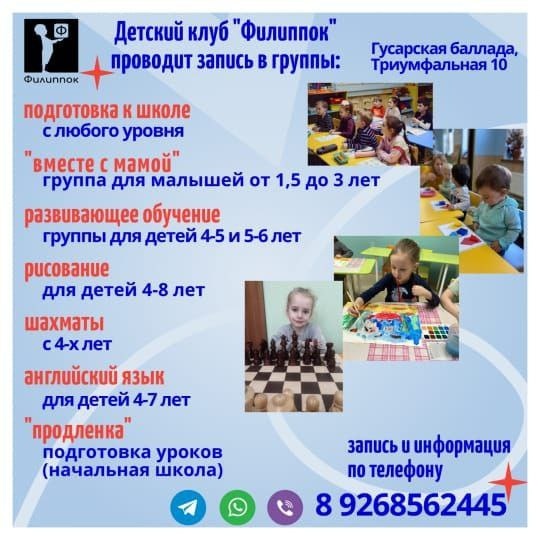 ❗️ДЕТСКИЙ КЛУБ ФИЛИППОК ОТКРЫВАЕТ ЗАПИСЬ НА НОВЫЙ УЧЕБНЫЙ ГОД Наши направления: 🔵Подготовка к школе📚 Есть группы для детей 6-7 лет с начальным уровнем знаний и для детей уже читающих. На занятиях учимся читать и понимать смысл прочитанного, работать с текстом, развиваем речь, решаем примеры и задачи, (программа Л. Г. Петерсон), работаем в прописях. По окончании наших курсов - ВСЕ дети читают 🔵"Вместе с мамой"🍼 Группа для малышей от 1,5 до 2,5 лет. Играем в Монтессори игры, знакомимся с окружающим миром, работаем над развитием речи, танцуем, лепим, рисуем 🔵Развивающее обучение📖 Есть группы для детей 3-4 лет и 5-6 лет. На занятиях обучаемся чтению, развиваем устную речь, работаем с числом, складываем, вычитаем и сравниваем, готовим руку к письму, изучаем окружающий мир 🔵Шахматы♟ Группы для детей с 4 лет и для школьников. Возможно начало занятий с любого уровня игры 🔵Рисование🎨 Работаем гуашью, акварелью, пастелью. Создаём портреты, пейзажи, натюрморты 🔵Английский язык 🇮