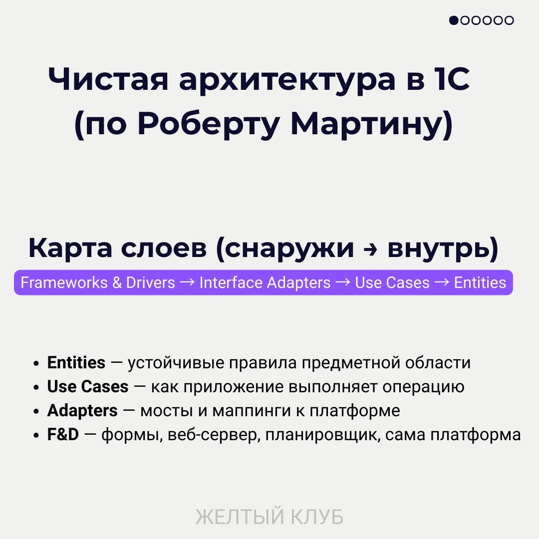 Смысл: архитектура — это способ управлять изменениями. Главный закон: зависимости направлены внутрь, к бизнес-правилам. Слои (снаружи → внутрь) Frameworks & Drivers → Interface Adapters → Use Cases → Entities 🧱 Entities (Сущности) — «о чём говорит бизнес вне компьютера» Что это: устойчивые правила и инварианты, которые директор по продажам понимает без разговоров про таблицы и формы. Это плоская структура + чистые функции модуля, который создает/валидирует/изменяет структуру и тем самым заставляет инварианты выполняться. Живут дольше UI/БД. Примеры инвариантов: 🟡 Количество ≥ 0 (целое для штучных товаров) 🟡 Сумма = Цена × Количество (округление по правилу X) 🟡 Нельзя отгрузить больше доступного остатка Не путать с use case-правилами: ❌ «Не проводить заказ при долге > кредитного лимита» ❌ «Скидка > 15% требует утверждения» В 1С размещение: Общие модули. Только чистые функции и простые типы/структуры Запрещено: обращения к формам, ролям, Запрос, ДокументОбъект. 🎛 Use Cases (Би