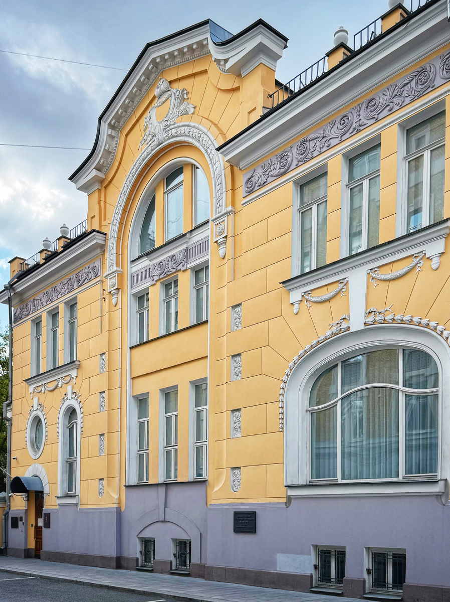 Купец первой гильдии Герман Ефимович Бройдо и его супруга Анжелика Гастоновна занимались тем, что выкупали земельные участки со старыми ветхими строениями, сносили их и застраивали заново особняками и доходными домами «под ключ» для дальнейшей перепродажи. Сейчас бы их называли красивым и непонятным словом «девелоперы». Большинство построенных ими сооружений находятся в районе Арбата и Пречистенки. Строительство на этом месте, в тихом переулке Арбата, они начали в 1910-м году. По их заказу архитектор Адольф Ноевич Зелигсон (он был евреем польского происхождения) построил изящный двухэтажный особняк с мезонином и полуподвалом, в облике которого читаются приемы французского направления модерна. Кроме этого особняка, расположенного по красной линии Денежного переулка, на участке был спроектирован ещё и четырехэтажный доходный дом в глубине двора, а ещё одноэтажный служебный корпус, предназначенный для конюшни и каретного сарая (он не сохранился). Что интересно, по некоторым сведениям, асс