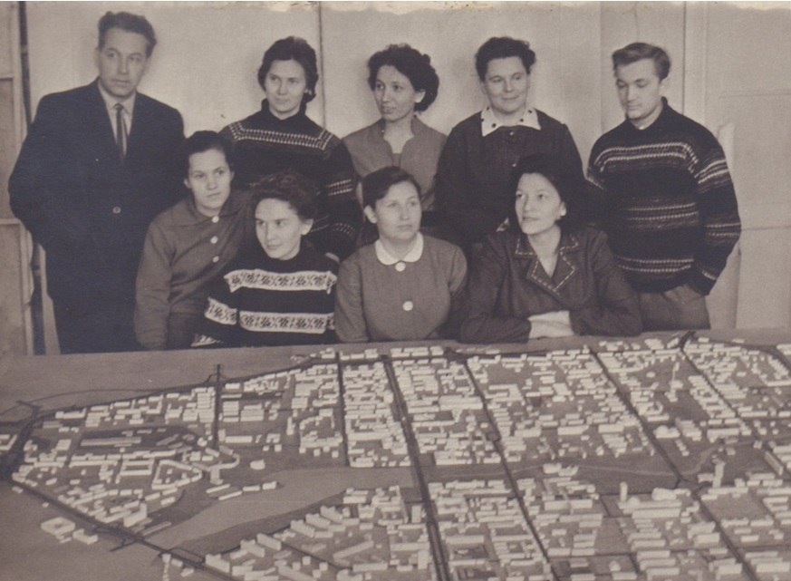Коллектив Мастерской генерального плана института Свердловскгражданпроект у макета Свердловска. 60-е гг. Стоят: Н.А. Барбарская, Л.П. Бандровская, Н.А. Андреева; сидят: К. Сапожникова, А.И.Цейкинская, Л.П. Винокурова Фото: Музей архитектуры и дизайна