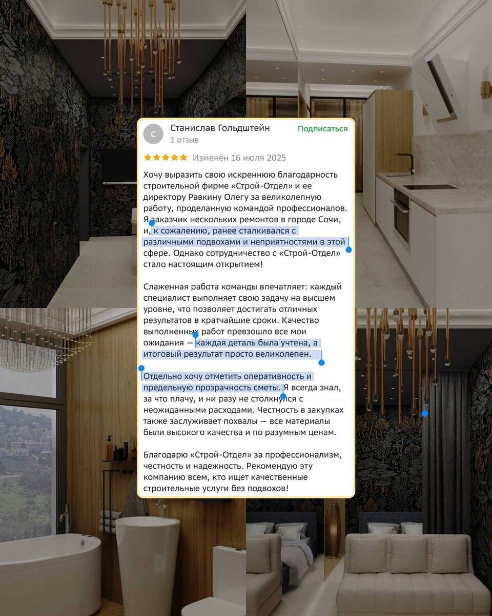 Ремонт без подвохов — а разве так бывает? Давайте разберём отзывы наших клиентов. Их прикрепили к посту. История показывает, что в процессе ремонта люди часто сталкиваются с непрофессионализмом мастеров, задержками, проблемами с покупкой материалов. Разберем, как мы еще до начала работы закрываем эти вопросы👇 📌«Я заказчик нескольких ремонтов в Сочи, и, к сожалению, ранее сталкивался с подвохами и неприятностями…» Что сделали мы: Оперативно согласовали смету и сроки, зафиксировали всё до мелочей. В процессе не было неожиданных расходов. Работа шла прозрачно, шаг за шагом. Итог: доверие и спокойствие вместо разочарований. 📌«Хотелось ремонт, который не нужно постоянно лично контролировать…» Что сделали мы: Регулярные видеоотчёты, постоянная связь, соблюдение сроков. Итог: через 3 месяца квартира была полностью готова — без лишних нервов и беготни. 📌«Ремонт полностью удалённо — было страшно, вдруг придётся всё время вникать?» Что сделали мы: Создали общую группу: дизайнер, про