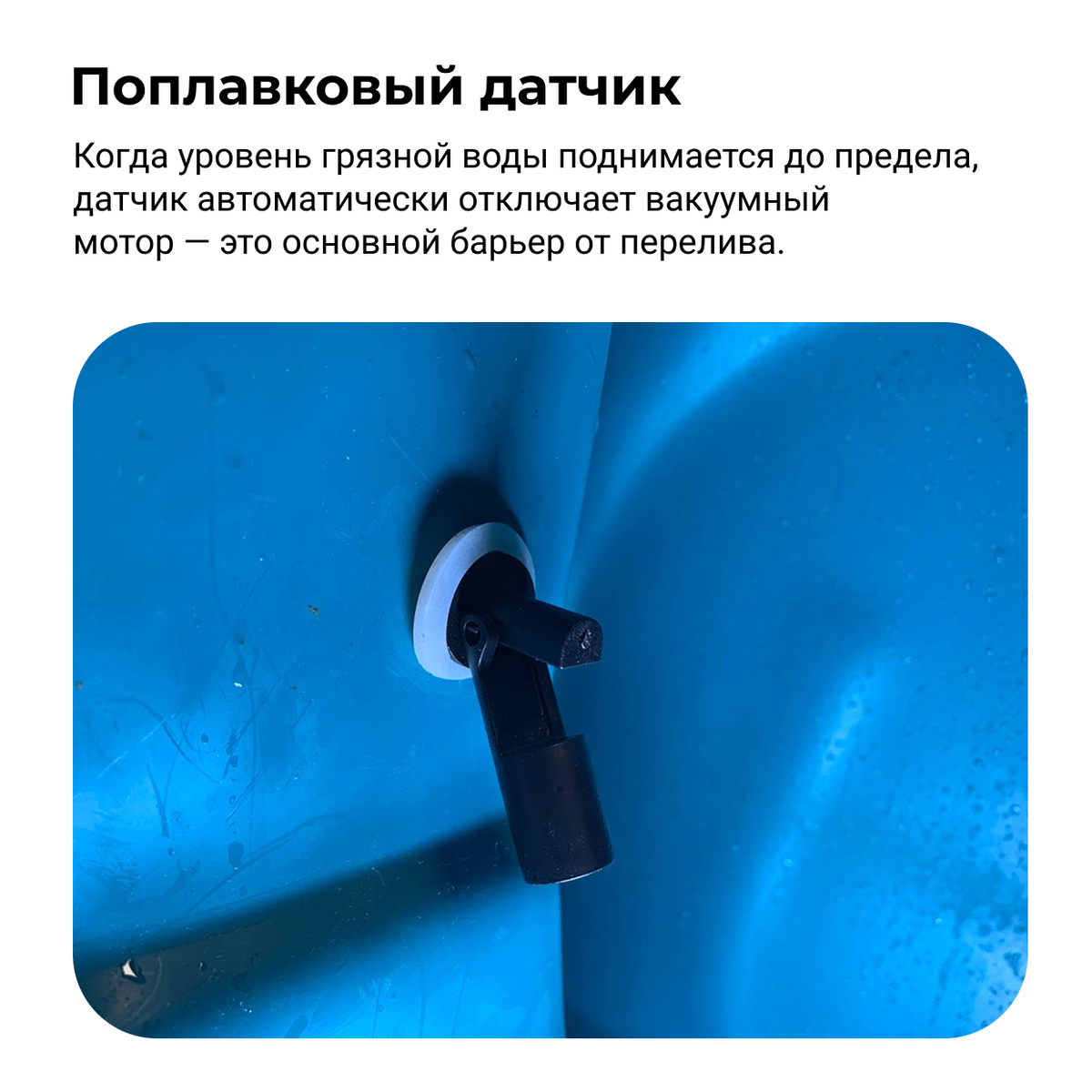 В поломоечной машине один из самых уязвимых компонентов — вакуумный мотор. Если в баке для грязной воды случается перелив, вода может попасть в мотор и вывести его из строя. А это — дорогостоящий ремонт. Чтобы исключить такую ситуацию, в Wellland F50P реализована система из четырёх уровней защиты. Она продлевает срок службы техники и избавляет от лишних трат на сервис. Всё начинается с поплавкового датчика. Он установлен в верхней части бака и реагирует на уровень воды. Как только жидкость достигает критической отметки, датчик срабатывает — и вакуумный мотор отключается. Это первый и основной барьер, который не даёт воде дойти до турбины. Вторая линия защиты — поплавковый фильтр. Внутри него находятся пластиковые шарики, которые при переливе всплывают и перекрывают канал всасывания. Даже если датчик не сработал, фильтр остановит движение воды дальше по системе. Следующий уровень — прозрачная крышка бака. Благодаря ей оператор может видеть, насколько заполнен резервуар, и при необходимо