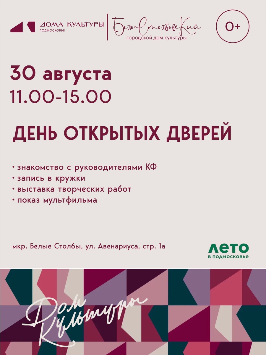 ✨ Приглашаем вас на День открытых дверей Белостолбовского городского Дома культуры🥳 Здесь вы сможете записаться сами или записать ребёнка в клубные формирования, а также познакомиться с их руководителями.😍 Вас ждут хореографические, вокальные, театральные коллективы, а также декоративно-прикладное творчество, развивающие кружки и многое другое. Группы работают как на платной, так и на бюджетной основе.🔝 До встречи🌸 🚫 Возраст: 0+ 📆 30.08.2025🕒11:00 🏢 Белостолбовский городской Дом культуры (ГДК) 📍 г.о.Домодедово, мкрн.Белые Cтолбы, ул. Авенариуса стр. 1а ✅ Мероприятия Домодедово https://dzen.ru/id/66f10385cc4c5a16f7b5fb02 http://vk.com/domodedovo_events http://dzen.ru/domodedovo_events