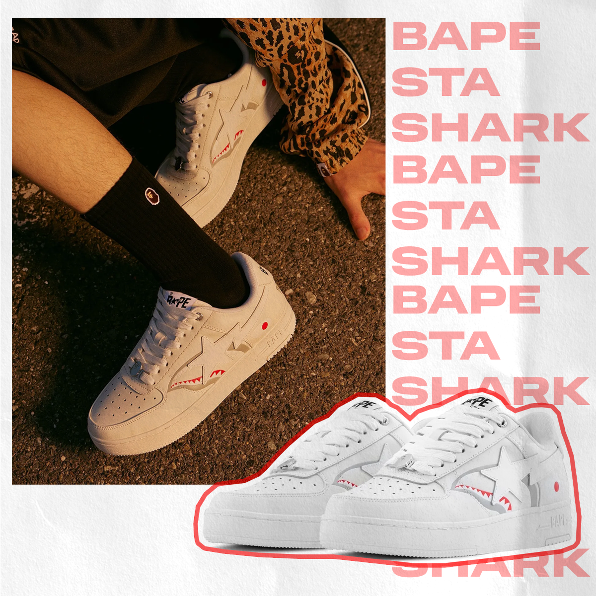 BAPE STA Shark снова появились в сникер-мире — на этот раз в трех разных расцветках: черной, белой и фиолетовой. Модель Shark вообще стала одной из самых известных у бренда за счет изображения своего довольно яркого дизайна. В этот раз у пар мягкий верх из кожи, логотипы-звезды из глянцевой лакированной кожи, фирменная символика «WGM» и флаг Японии. Нам фиолетовые сильно зашли. Больше интересного на нашем сайте POIZON