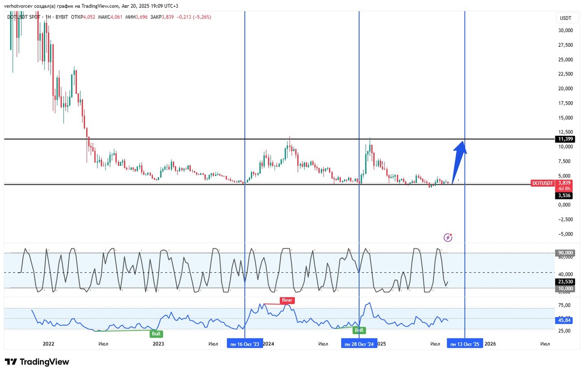 Сейчас я дам список альткоинов, на которые ставлю лично я, исходя из их цикла. 1. DOT — очень хороший и цикличный график. Цена постоянно отрастает от своего минимума примерно на 200%, именно октябрь месяц для DOT является ключевым. 2. TWT — похожий график, что и у DOT, начинает рост в сентябре. 3. FILCOIN (FILUSDT) — имеет похожий цикл, что и у первых двух. 4. APTUSDT Я сделал небольшую подборку альткоинов, у которых цикл роста начинается в сентябре-октябре. Лично я купил эти альткоины и держу в своем портфеле, покупать ли их вам — это лично ваше решение.