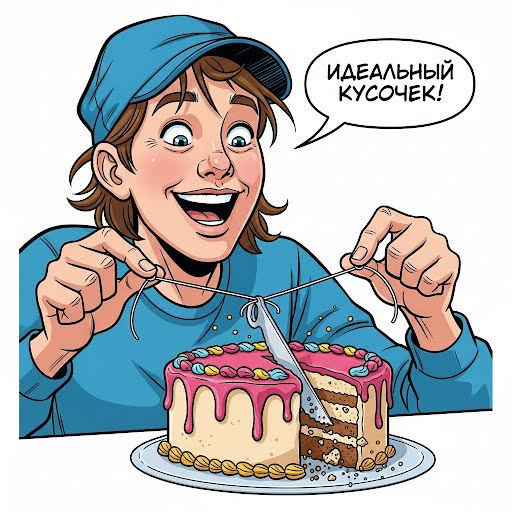 ЛОВИ ЛАЙФХАК Привет, друзья! Приготовили или купили красивый торт, но не можете его ровно разрезать? Коржи мнутся, крем размазывается, а кусочки получаются неаккуратными. Не беда! У меня есть гениальный лайфхак, который поможет вам разрезать любой торт идеально ровно и красиво. Лайфхак: зубная нить для торта Как это работает? Магия здесь тоже проста, и для неё вам нужна обычная зубная нить. Да, та самая, что помогает чистить зубы. * Приготовьте: Возьмите отрезок зубной нити длиной около 30 см. Важно, чтобы нить была без вкуса и аромата. * Разрежьте: Аккуратно натяните нить и опустите её сверху вниз, разрезая торт. Вы увидите, как нить легко и ровно проходит сквозь коржи и крем. * Готово: Вы получите идеально ровный и красивый кусочек. Что происходит? Тонкая и прочная зубная нить создает минимальное сопротивление при разрезании торта. В отличие от ножа, который может помять коржи и размазать крем, нить делает чистый и ровный срез. Это простой, доступный и невероятно эффективный спосо