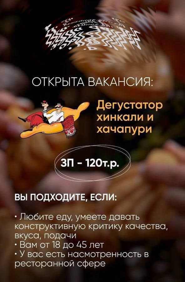 120 тысяч рублей будут платить дегустатору хинкали и хачапури. Такого специалиста срочно ищут в ресторан в Ростове. Работнику предстоит просто оценивать блюда грузинской кухни и помогать улучшать их качество. Уже заезженный маркетинг, пиар публикация не существующей вакансии или объявления, для привлечения внимания к компании и упоминанию и цитируемости в различных источниках.