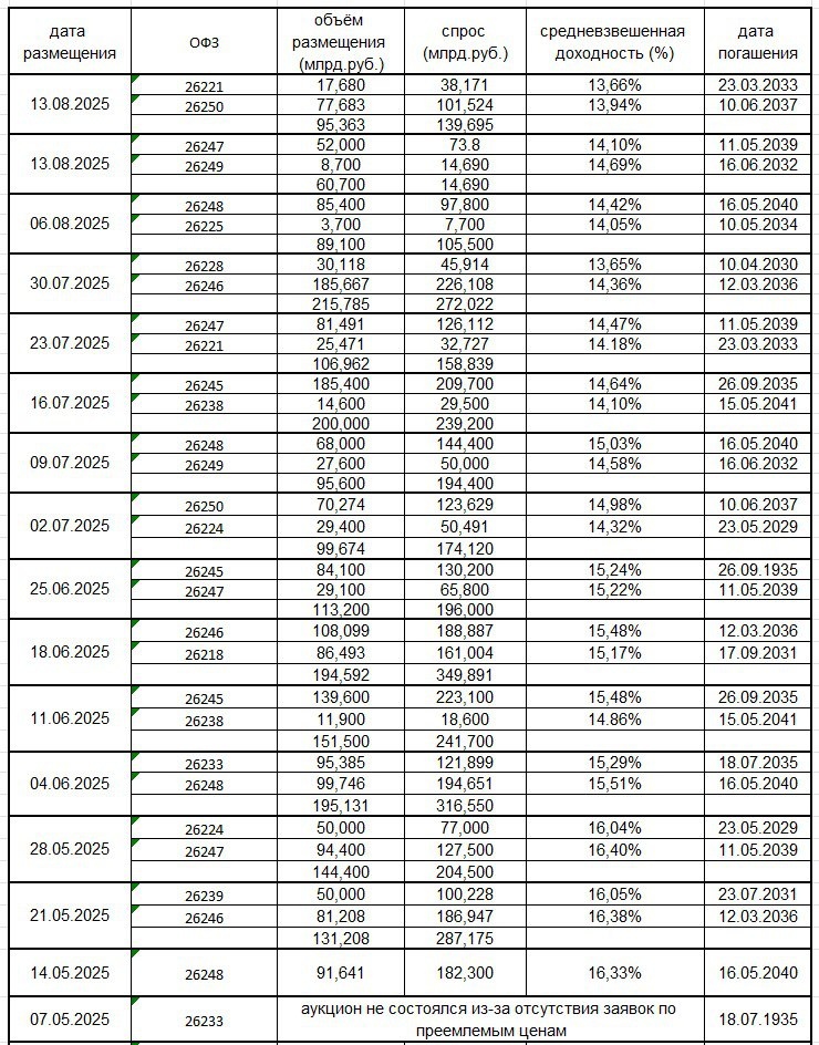 Итог аукционов ОФЗ 20 августа 2025г Еженедельно по средам Минфин проводит аукционы ОФЗ Чтобы выполнить план, Минфину нужно размещать по 100 млрд руб. в неделю. Сегодня спрос был 139 млрд руб. Размещено 95 млрд руб. (примерно по плану) В мае не было спроса, отменяли аукцион из — за отсутствия спроса. Дефицит бюджета финансируют через эмиссию ОФЗ. Пока Минфин идёт с опережением плана. Выполнение плана размещения ОФЗ очень важно для покрытия дефицита бюджета. Дефицит бюджета за 7 месяцев 2025 года составил 4,88 трлн рублей или 2,2% годового ВВП, сообщил Минфин. Аукционы по размещению ОФЗ позволяют оценить конъюнктуру рынка и понять, под какую доходность инвесторы готовы кредитовать государство. Высокий уровень спроса позволяет государству рассчитывать при следующем размещении на более низкий процент по займам, а низкий спрос, напротив, говорит о необходимости дать инвесторам большую доходность или дождаться более подходящей рыночной ситуации.