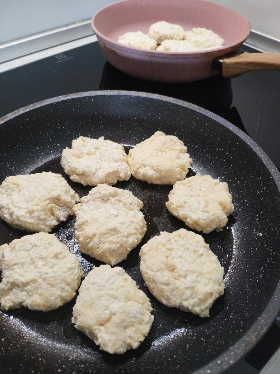 Сырники самый мой любимый вариант творога. Я не очень люблю творог, особенно зимой. Но вот сырники совсем другое дело. Горячие вкусные и очень полезные. Я давно искала хороший рецепт сырников. Пробовала больше или меньше муки, манки, сахара. Пробовала лепить руками или ножом. Получалось очень грустно. Потому что они все время расплывались и превращались в подгоревшую кашу. Мы, конечно, ели, но этот напрочь отбивало желание сделать домашние сырники, на год. Потом проходило время и снова появлялось вдохновение. Казалось, что нужно немного больше манки или муки и сырники будут, как в ресторане. Увы и ах. Недавно я нашла свою ошибку и , по совместительству, секрет жарки сырников. Здесь с вами им и поделюсь. Нам понадобится: Творог 600г Яйца 3шт Сахар 70г Соль щепотка Мука 150г. Ванильный сахар Рецепт. 1.Кладём в миску творог, сахар, яйца, соль. Все хорошо пробиваем блендером. Если хотим есть без варенья, но сладкие, добавляем больше сахара 2. Добавляем начинку, если хочется. Обычно эт