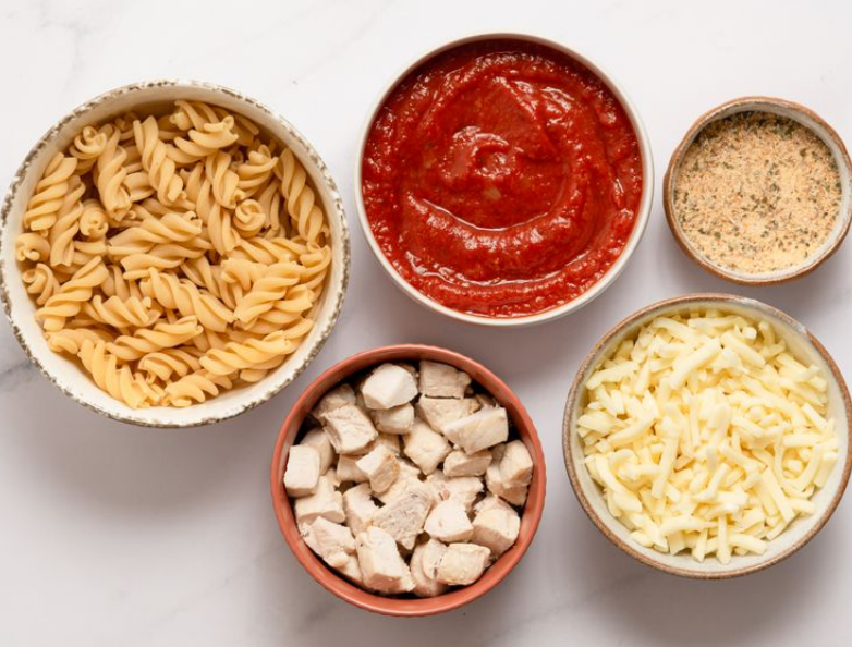Эта простая запеканка с курицей по-пармезански, приготовленная из вареной курицы, пасты, соуса маринара, сыра и хрустящих панировочных сухарей, является вкусным вариантом приготовления домашней курицы. Время приготовления — 50 минут. 6 порций. Ингредиенты: 1. Соберите все ингредиенты. Разогрейте духовку до 175 градусов. 2. Наполните большую кастрюлю слегка подсоленной водой и доведите до бурного кипения на сильном огне. Варите макароны в кипящей воде до размягчения, но чтобы они не переварились и сохранили лёгкую упругость, примерно 8 минут. Слейте воду. 3. Смешайте вареные макароны, курицу и сыр моцарелла в большой форме для приготовления запеканок. 4. Вылейте соус маринара на смесь с макаронами; посыпьте панировочными сухарями. Накройте блюдо алюминиевой фольгой. 5. Запекайте в разогретой духовке до тех пор, пока сыр не расплавится, примерно 35 минут. 6. Подавайте и наслаждайтесь! В одной порции: 359 килокалорий, 11 граммов жиров, 39 граммов углеводов, 24 грамма белка.