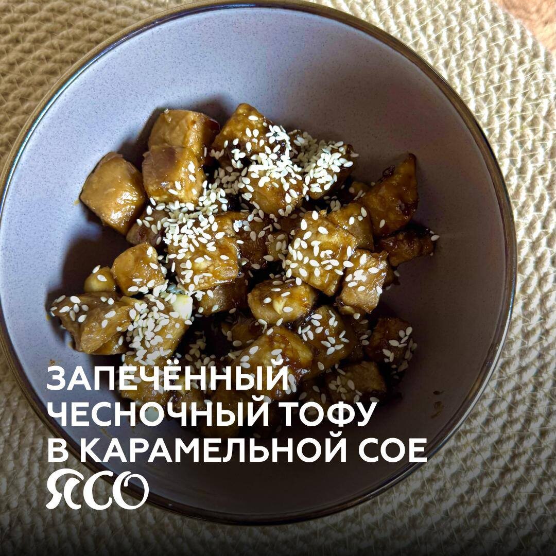 Запечённый чесночный тофу в карамельной сое Продукты: Тофу – 175 г Соевый соус – 2 ст. л. Кленовый сироп/сахар – 1 ч. л. Чеснок – 2–3 зубчика Немного масла и крахмала 1️⃣Тофу нарежьте кубиками, обваляйте в крахмале. 2️⃣Выложите на пергамент и запекайте в духовке 20 мин при 200°С, пока не подрумянится. 3️⃣Тем временем смещайте на сковороде: соевый соус, сироп, тёртый чеснок — слегка уварить. 4️⃣Готовый тофу обвалять в этой карамельной глазури. Подавать можно с рисом, лапшой или просто так. 🤩ЯСО "Натуральный" на wb на ozon #тофу_ЯСО #до30минут #закуска #обед #ужин