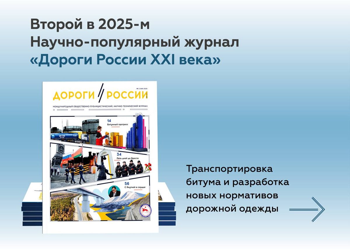 Вышел второй выпуск журнала «Дороги России XXI века» В центре внимания — «горячая» тема об условиях транспортировки битума. Результаты масштабного исследования подтвердили допустимость повышения температуры налива до 200 °С и транспортировки вяжущих на большие расстояния без дополнительного разогрева. О том, как рождалось это решение, поговорили с представителями «Газпромнефть – Битумные материалы» и ФГБУ «Росдортехнология». Также открыли рубрику «Инфраструктура для жизни». В ней будем рассказывать о важных социальных объектах вдоль трасс, улучшаемых в рамках одноимённого нацпроекта. Не секрет, что благодаря качественной дороге небольшой городок или село может стать центром притяжения туристов. В журнале вы узнаете про три не самых известных места, каждое из которых обладает душой и историей. Ещё вас ждут ключевые итоги конференции «Дорожное строительство в России. Инновации, технологии, качество»; фоторепортаж с автопробега «Маршрутом мужества» к 80-летию Победы; воспоминания о «