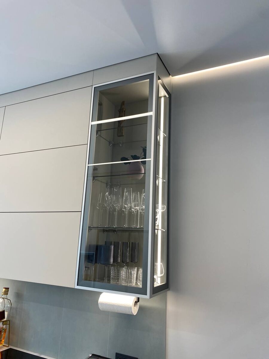 Эта витрина с прозрачным стеклом - наше авторское изделие, изготовленное специально для клиента! Такие высокие витрины с угловым застеклением на фабрике не изготавливают, поэтому на этом проекте мы использовали по максимуму навыки наших сборщиков😁 Посовещавшись, заказали отдельные детали на фабрике: боковины и задняя стенка шкафа с присадками по нашему чертежу, а также 2 стеклянные витрины. По месту сделали сверления в стекле, заполнили сверления герметиком и установили жестко в них штоки эксцентриковых стяжек, затем все стянули. Стяжек для надежности было много)) В итоге у нас получилась вот такая высокая витрина, правая боковина которой является алюминиевой рамкой со стеклом, и не одного лицевого сверления, все винты скрыты от глаз с обратных сторон стенок👌🏻 Информация по кухне: 🔴Фасады | AGT Supramat 3019 Sahara Cream (Сахара Супрамат) 🔴Корпус | ЛДСП 18 мм Ярко-Серый 🔴Столешница | Кварц Avant 7500 Калакатта Аррас 🔴Фурнитура | Blum, Hettich, Boyard, Volpato, GTV 🔴Подсвет